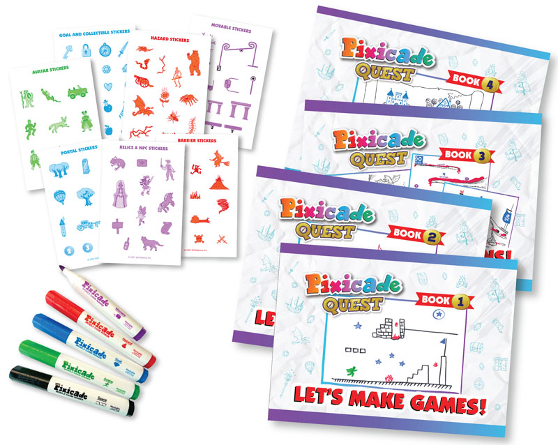 Includes 4 Books with 50 game design concepts, 2 creation codes, 90 game stickers, instructions, and 5 non-toxic markers. Each creation code includes 800 game creations, primary powerups and edits, quest expansion and edits, 8 game types, quest map maker, and avatar creation library. Creates 1600 custom games total.