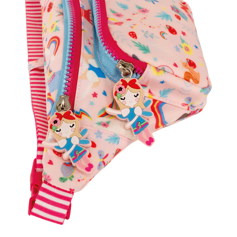 Our Rainbow Fairy design has two chunky, fairy shaped zip pulls, two handy compartments and an adjustable strap in a gorgeous striped material. Inside the bag is a lovely Rainbow Fairy print and an ‘I belong to…’ label for personalization.
