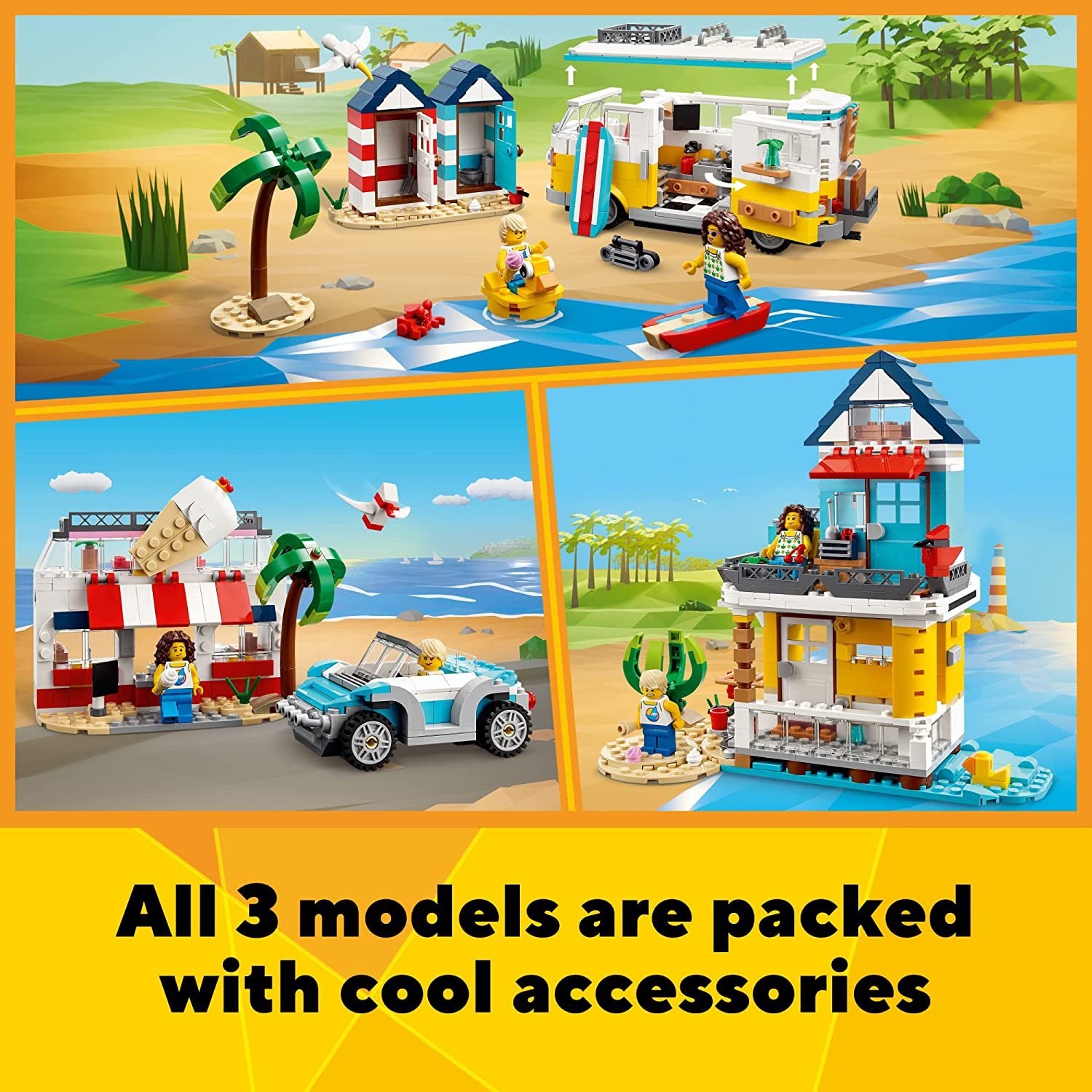 Kids ages 8+ can dream up sandy stories at the beach with this stunning LEGO Creator 3 in 1 Beach Camper Van (31138) building toy set. Kids can role-play packing their bags and take a trip to the beach for fun in the sun! LEGO fans can choose from 3 different buildable beach scenes with this LEGO Creator 3 in 1 set. It features a camper van toy with a kitchen and bedroom inside, a removable roof, an opening side door and 2 minifigures. It’s accompanied by 2 beach huts, a palm tree, 2 brick-built surfboards, a pair of sun loungers and an albatross. When it's time for the next part of the adventure, kids can rebuild the LEGO summer set into a 2-floor summer beach house next to a water-and-sand scene, or rebuild it into an ice-cream shop with a serving window, second-floor terrace with tables and a supercool beach buggy. To add an extra element to the fun, kids can also download the LEGO Builder app and step into a new world of building fun where they can zoom in and rotate models in 3D, save sets and track their progress. This LEGO Creator 3 in 1 Summer set gives children the chance to enjoy 3 different build-and-play adventures and makes a fantastic LEGO gift idea for passionate little builder kids ages 8+ years old.