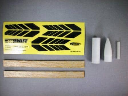 The Swift measures in at an ultra tiny 4.5 inches in length but can reach amazing heights of 850 feet! It’s easy to build and finish, having just 10 parts including wood fins for precision performance, a plastic nose cone for durability and cool black and white, easy to apply self-stick decals. No worries about packing the parachute because this high performance mini rocket safely tumbles back to earth after every launch.