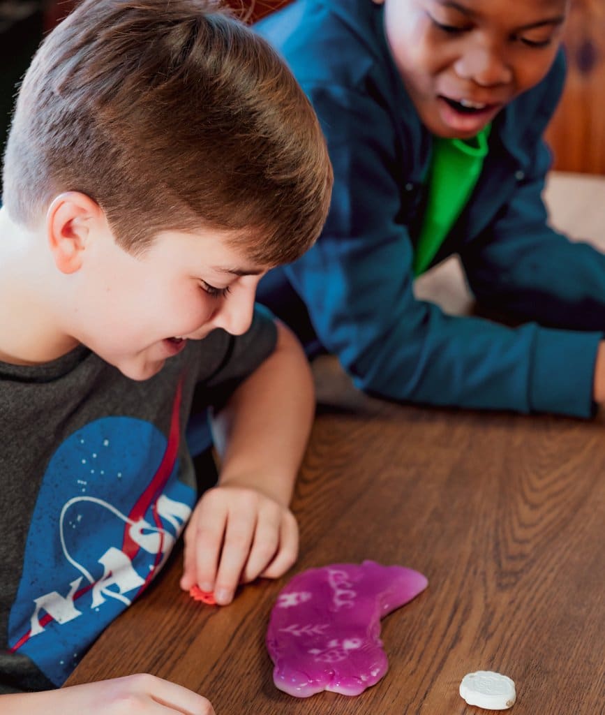 Emulate this fire and ice scenario with Arctic Flare Thinking Putty®. Shining white putty gives way to magenta with the included Glow Charger® and glows amber in the dark.