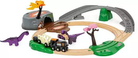 Explore the amazing prehistoric world of dinosaurs in the 36094 Dinosaur Adventure Set. This 21-piece train set is full of dinosaur-themed play and includes a train with two wagons, multiple scenic pieces like the dangerous lava cave and grassy meadow tracks, as well as train play across different levels. Three playful dinosaurs are included in this playset, all featuring colourful designs, unique moving parts and classic BRIO magnets to interact with the world around them.