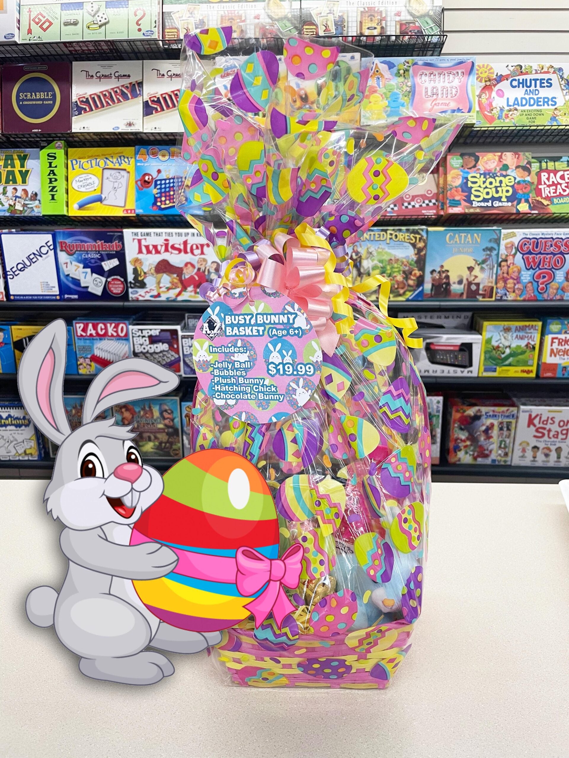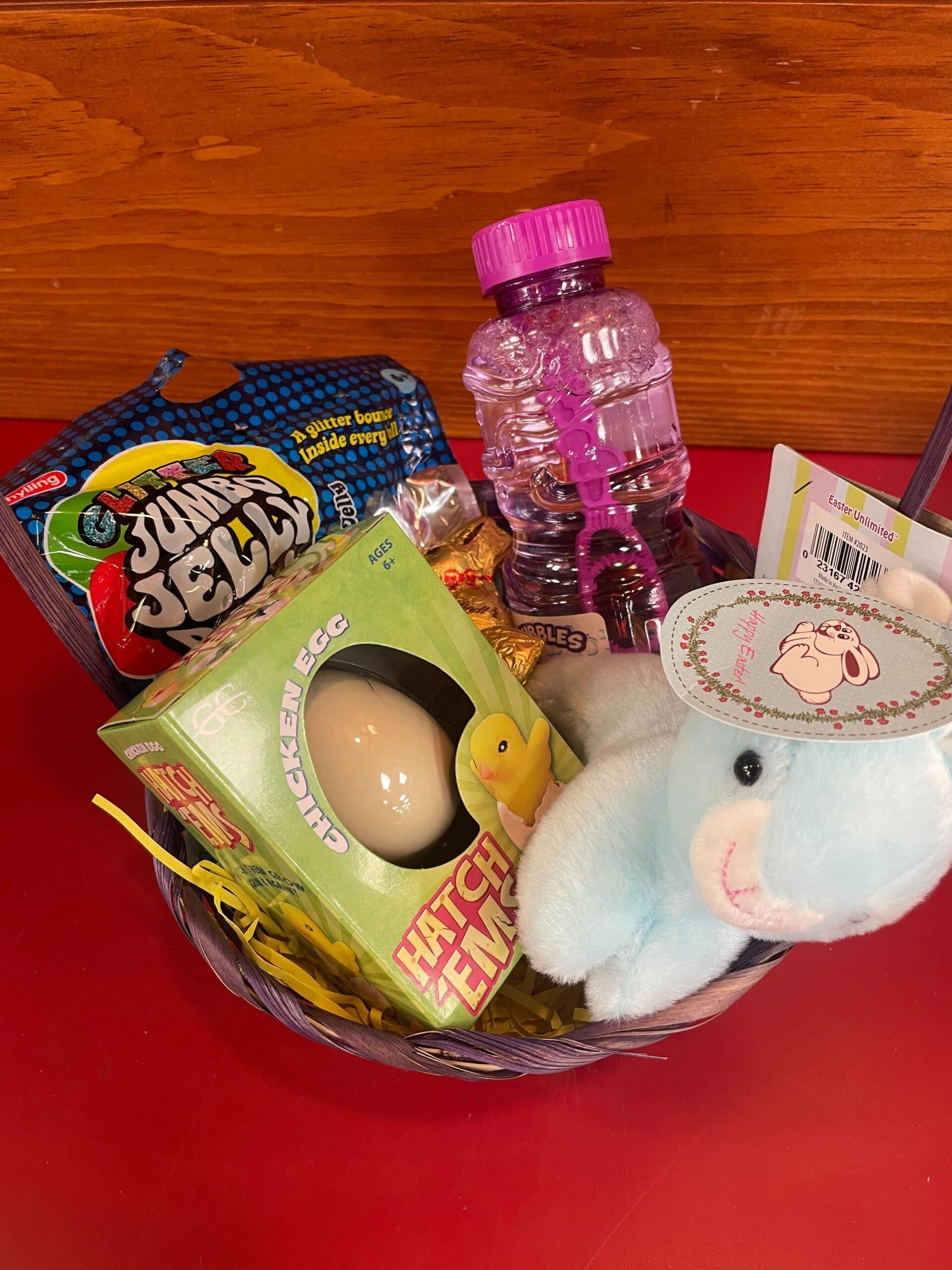 An awesome Easter basket to keep kids busy! Includes Bubbles, Giant Jelly Ball, Hatching Chick, Chocolate Bunny and a Plush Bunny! *basket style may vary.