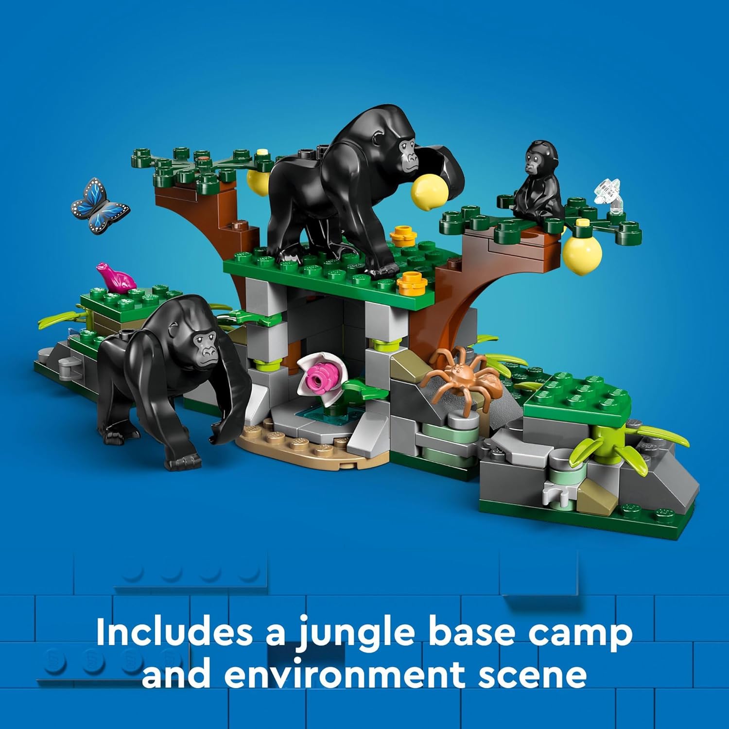 Treat your little explorer to the LEGO City Jungle Explorer Helicopter at Base Camp (60437) adventure playset for ages 8 and up, featuring a realistic helicopter toy with synchronized twin rotors, 2 cargo bays and a working winch. The set also includes a motorcycle, swamp boat and jungle base camp, plus 5 adventurer minifigures and 3 gorilla toy figures, including a baby gorilla, for imaginative play and storytelling. This LEGO City jungle building toy includes a step-by-step printed building guide and 3D instructions in the LEGO Builder app – a digital building companion with intuitive zoom and rotate tools that enable kids to visualize models from all angles as they build. LEGO City sets make great holiday and birthday gifts for kids, with cool vehicles, realistic structures and fun characters that inspire imaginative play without limits. Kids can add this jungle animal toy set to other playsets (sold separately) from the LEGO City range to expand the world of play possibilities. Contains 881 pieces.