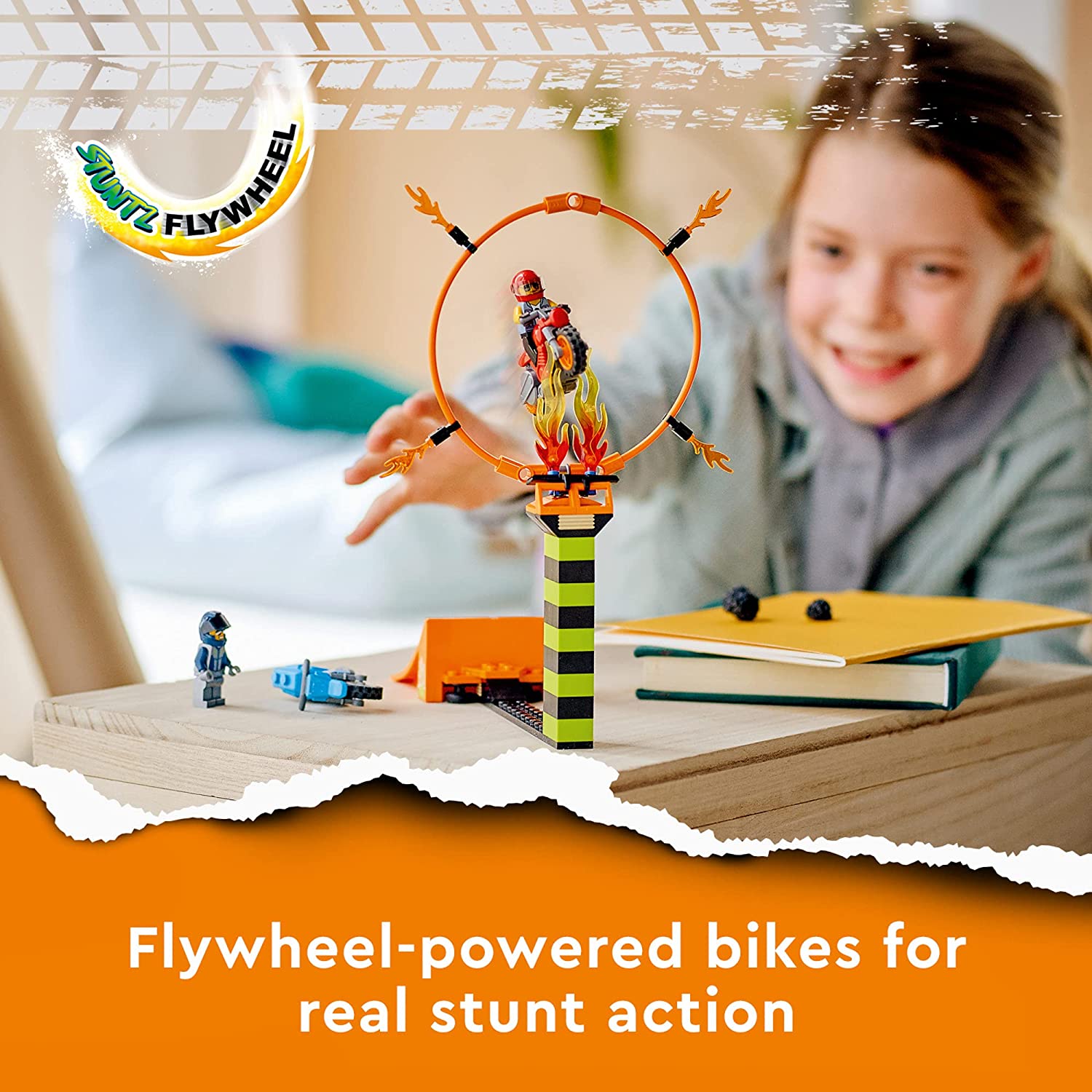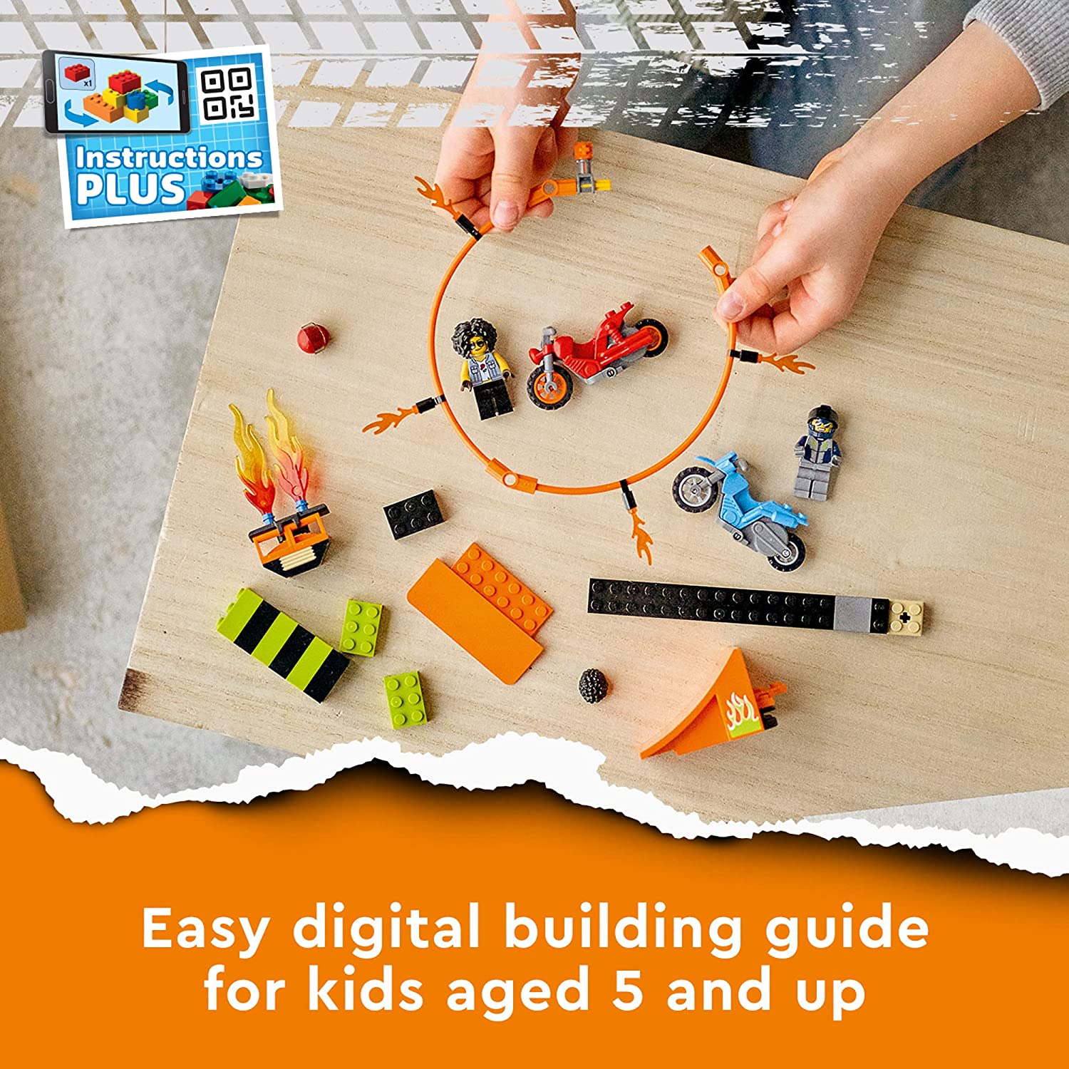 Boys and girls who like to compete will love this LEGO City Stunt Competition (60299) toy playset, featuring 2 flywheel-powered motorcycles for performing amazing wheelies and high-flying stunts. Kids also get a reconfigurable launch ramp and a ring-of-fire stunt course. Just add the rider and LEGO City TV Duke DeTain minifigures for spectacular stunt action! Includes a digital building guide for kids aged 5 and up This playset comes with a step-by-step printed building guide and Instructions PLUS. Part of the free LEGO Building Instructions app for smartphones and tablets, this interactive construction guide, with zoom and rotate viewing tools, makes LEGO building child’s play. Cool toys for kids LEGO City Stuntz sets put kids at the heart of the action with flywheel-powered bikes, realistic structures and fun characters that inspire imaginative role play based on real-life events. Combine playsets from the LEGO City Stuntz universe for even bigger stunt-show extravaganzas!