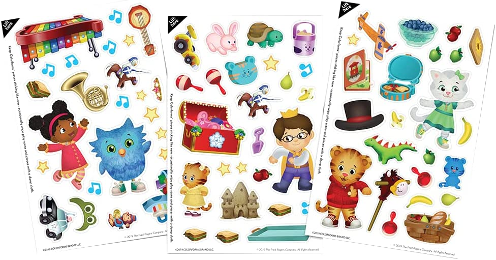 Enjoy classic Colorforms play anywhere with your favorite characters from Daniel Tiger’s Neighborhood! Mix and match the pieces for playtime fun with Daniel, Miss Katerina and friends! This fold-out, double-sided play set stores the re-stickable pieces with a resealable closure for mess-free play on the go. The set includes 2 colorful play scenes and 3 sheets with over 70 re-stickable Colorforms pieces. Everything folds up and stores neatly when the fun is done!