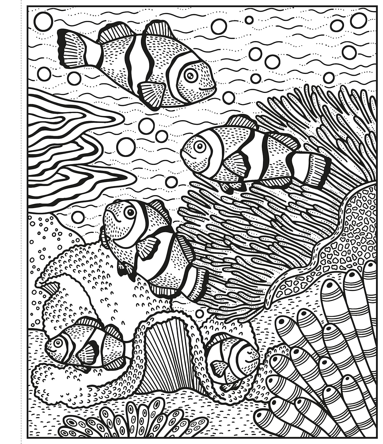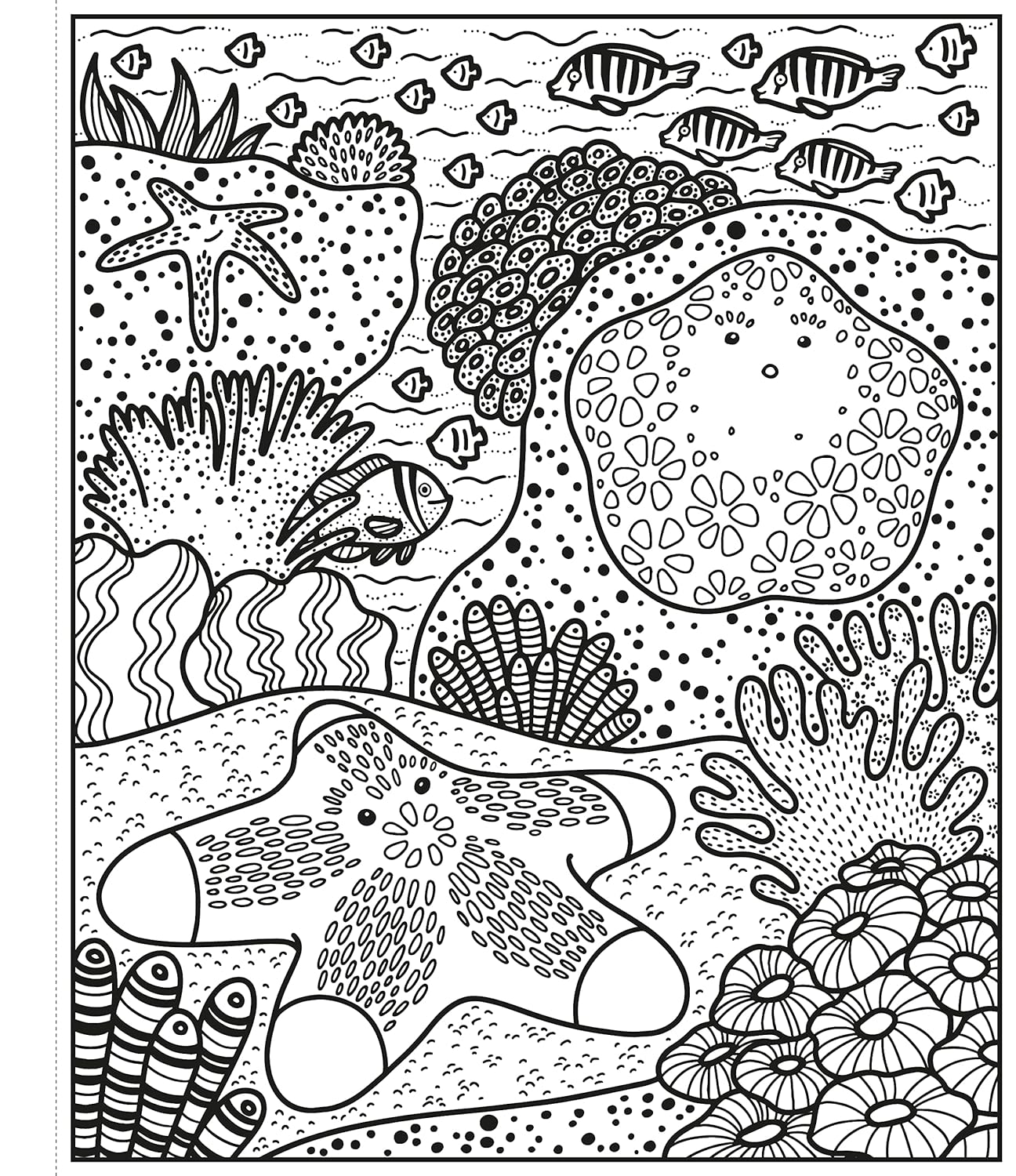 Packed with fascinating scenes showing fish, turtles and other sea creatures swimming among beautiful corals. Simply brush water over the black and white designs to reveal an array of glorious colors.