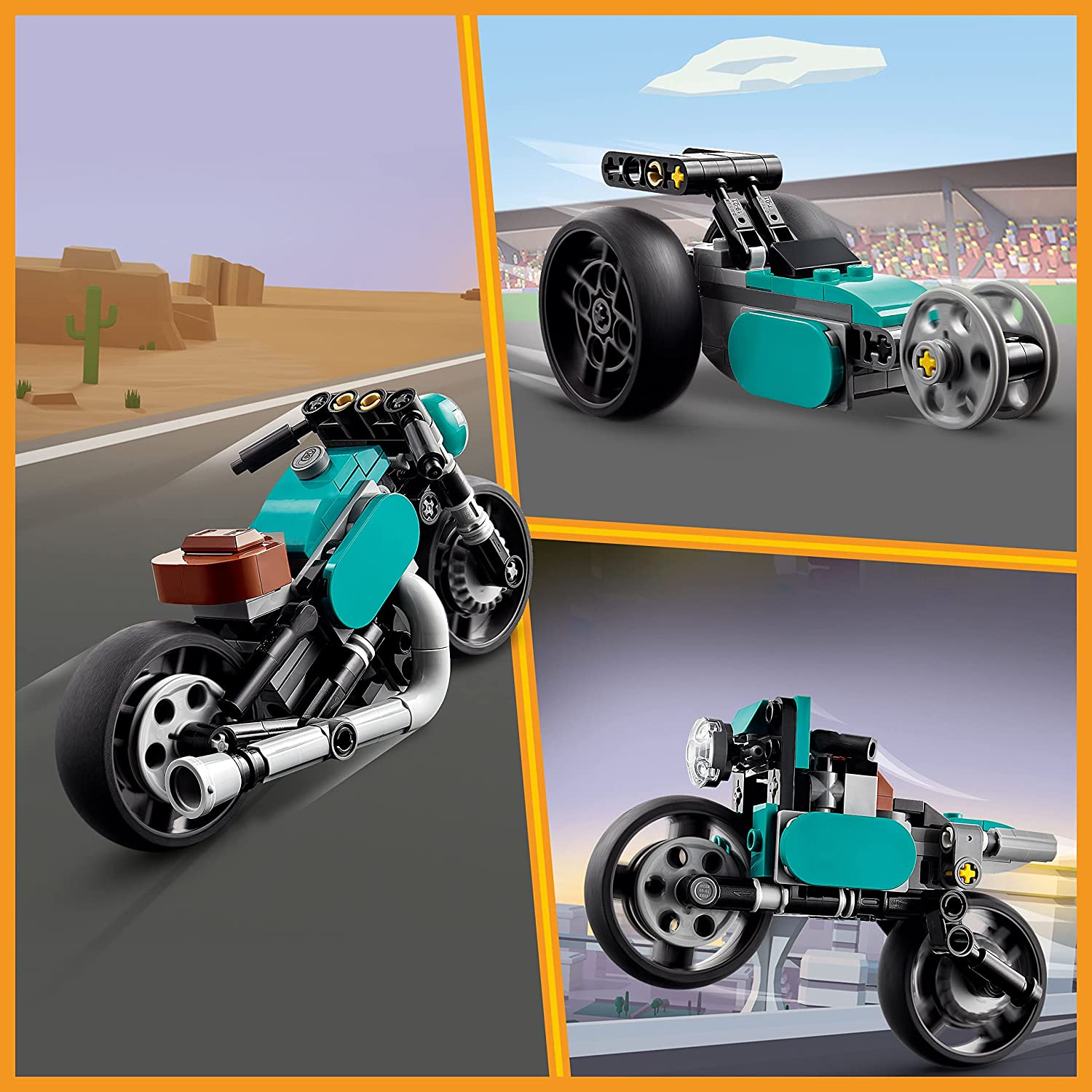 Kids and lovers of cool vehicles ages 8+ years old can enjoy countless hours of racing action with this brilliant LEGO Creator 3 in 1 Vintage Motorcycle (31135) building toy set. The thrills never stop with this fantastic 3 in 1 building set. LEGO fans have the choice of 3 different build-and-play experiences with this Creator 3 in 1 construction toy set. The classic toy motorcycle features handlebars, a moving front wheel, headlights, a large exhaust and a kickstand for display. Then, when they're ready, kids can rebuild it into a street bike with a kickstand for display, create a top fuel dragster car toy to take part in exciting races – or even use their imaginations to create their own LEGO vehicles with the bricks. For a fun build experience, download the LEGO Builder app and step into a new world of building fun where kids can zoom in and rotate models in 3D, save sets and track their progress. This awesome LEGO Creator 3 in 1 set lets little builders enjoy a fun-filled build before they create high-speed stories with the vehicles, and makes a great birthday gift idea for kids ages 8 plus years old and fans of vintage motorcycles and LEGO vehicles.