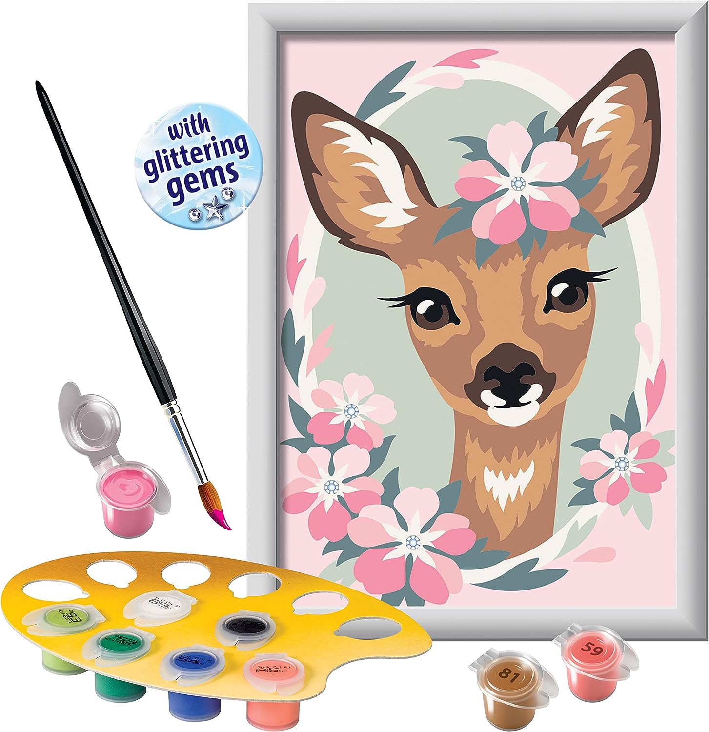 Encourage your sweet child or grandchild to dabble in the arts with our darling CreArt “Delightful Deer” Painting by Numbers set with glittering gems! Let kids add some dazzle to their down time with this “Delightful Deer” CreArt paint-by-numbers kit! They can relax with this fun and satisfying activity, complete with everything needed to make and display their very own masterpiece, including glittering gems! Painting is a snap, with color-outlined sections and matching, odorless acrylic paints to ensure picture-perfect results. Finish in about 4 hours, let dry, then use the included frame to proudly display your budding artist’s talent! Looking for a fun activity that keeps your kids off their screens? Help them discover their inner artist with CreArt, our high-quality Painting by Numbers sets! With kid-friendly images designed to match abilities, budding artists can enjoy completing their very own painting in just a few hours. Easy-to-see colored outlines distinguish each section, helping kids achieve great results. Painting is a fun, creative activity that can also improve dexterity and concentration while providing a sense of satisfaction! CreArt contains everything children need to create their painting: a high-quality, thick painting board; 10 water-based, opaque acrylic paints in numbered pots; pallet to hold the easy-open/resealable paint pots steady; durable, fine-point paintbrush; easy-to-follow guide sheet; glittering gems with finish/glue; and frame to display their finished artwork. Makes a great gift!