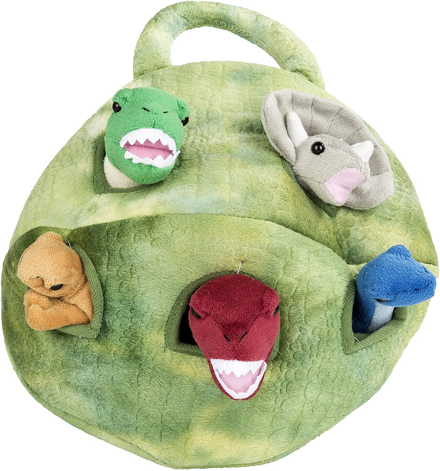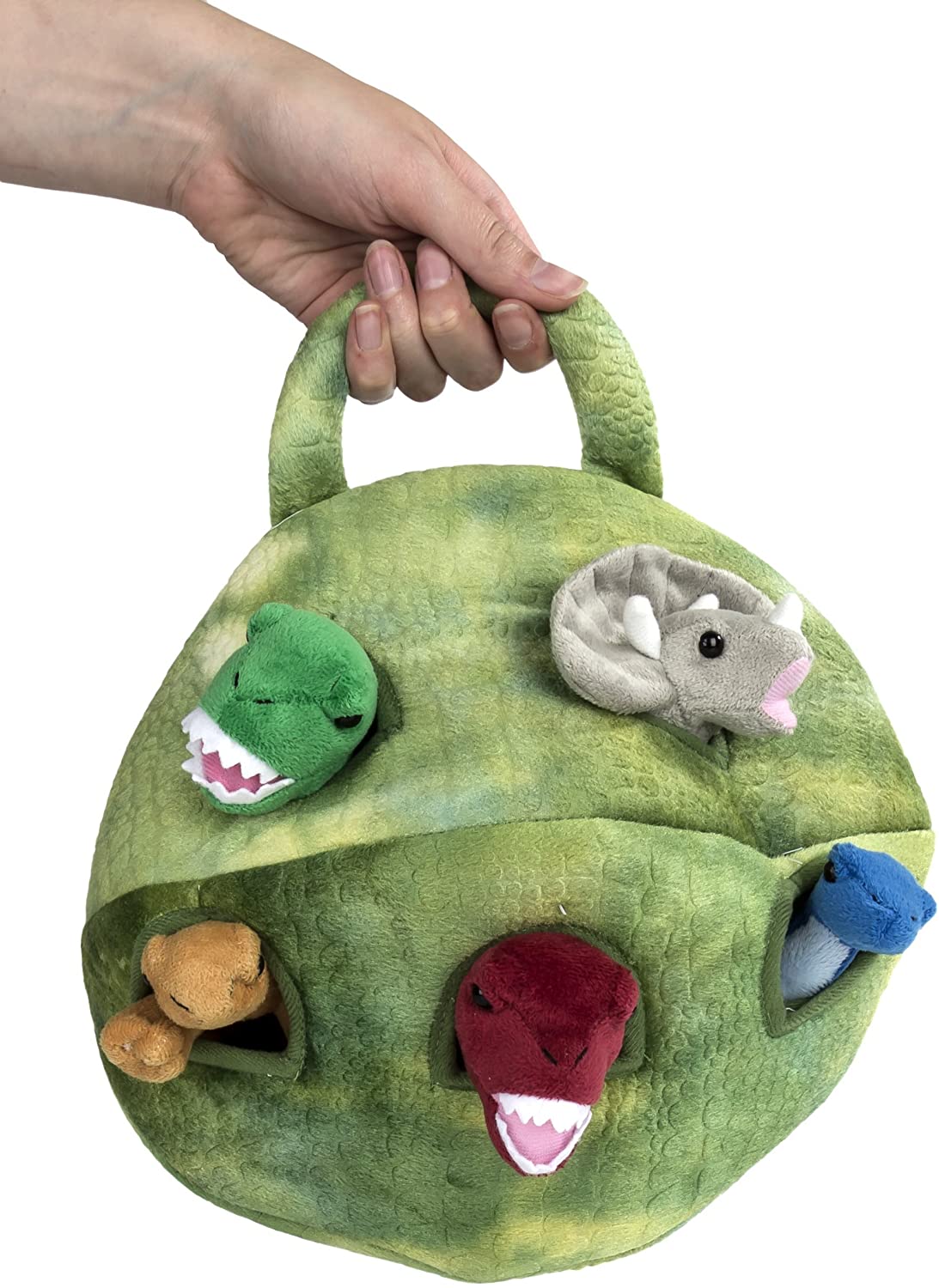 12" Plush Dinosaur House with 5 cuddly dinosaurs. All the dinos can be stored in the house when not in use. 6" "bean" filled dinos, all different ,all incredibly cute Handy handle for carrying. Washable. Unique toy for creative play. Cuddly. Great for travel.
