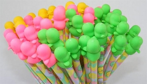 This HB graphite pencil comes with a baby duck rubber eraser topper.