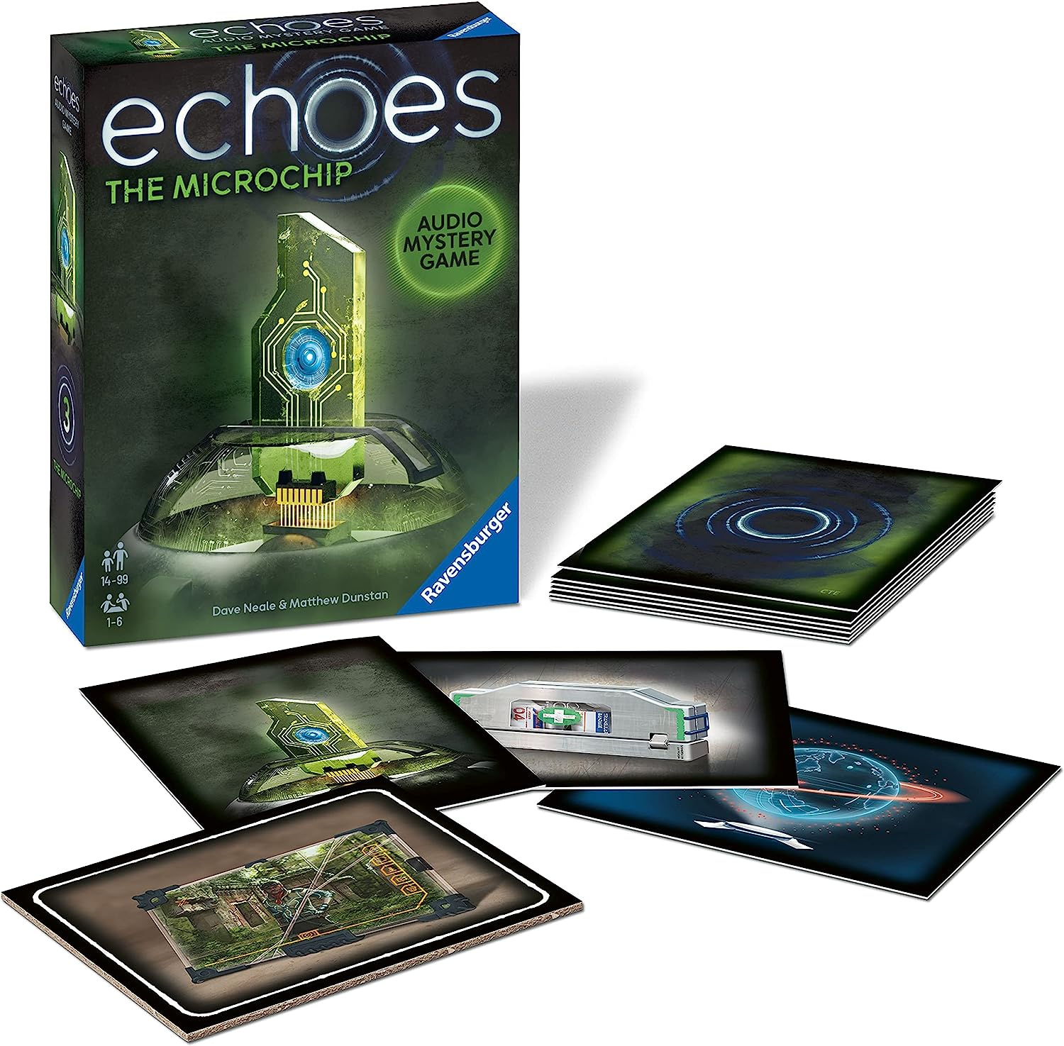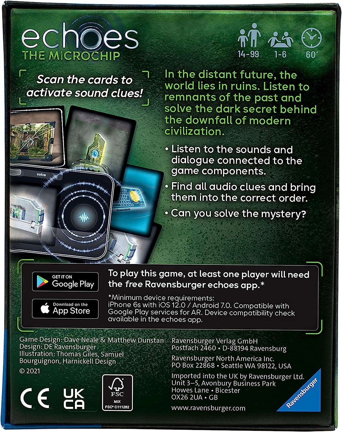 In echoes , a new and highly immersive audio mystery series from Ravensburger, players use a deck of illustrated cards and spine - tingling sound clues to complete a story and solve a mystery. In the far future, civilization is lying in ruins, and the echoes of the past hide the tragic story of its downfall. See whether you can uncover the truth. Playing echoes Players will need a free companion app to play echoes . Install the app and use your camera to scan cards and play the audio clues associated with each illustration. Each echoes story is comprised of six chapters. Each chapter starts with a chapter marker tile followed by three story cards. Players solve indi vidual chapters first, then work together to put the chapters in order. When players think they have a chapter solved, they can use the app to check. The app will tell them how many cards belong in the chapter and whether the cards are in the right order. When a chapter is solved successfully, the app will give an overview with additional details added, helping the players understand and solve the overall story. Finally, when each chapter is pieced together successfully, players put the complete tale in order. When they have solved the mystery, they can listen to an epilogue that completes the story!