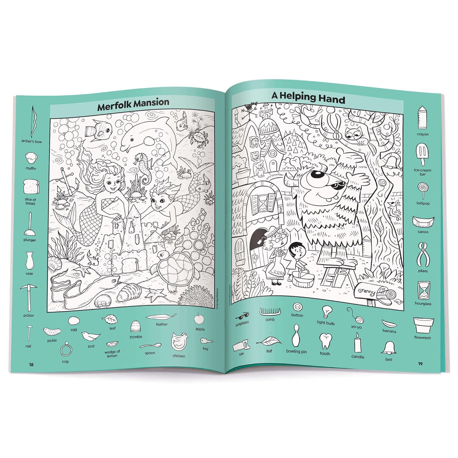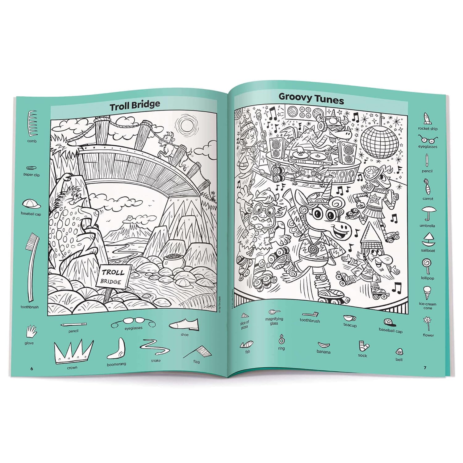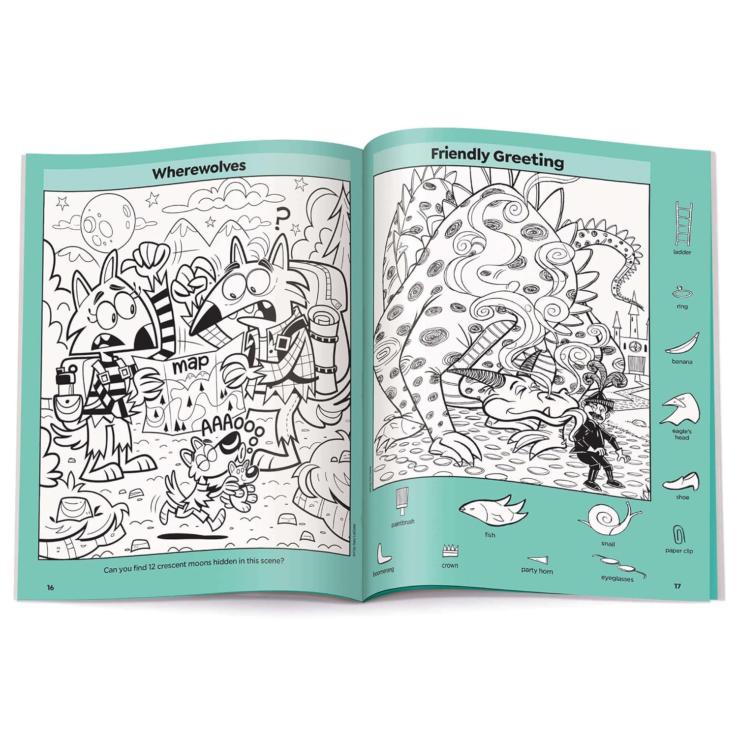 The humorous scenes in this 144-page book include a symphony of unicorn musicians; a goat crossing a troll bridge; plus even more fantastical scenes with illustrations of dragons, fairies, monsters, and more. When kids solve all the puzzles, they can double the fun by coloring in the black-and-white pages.