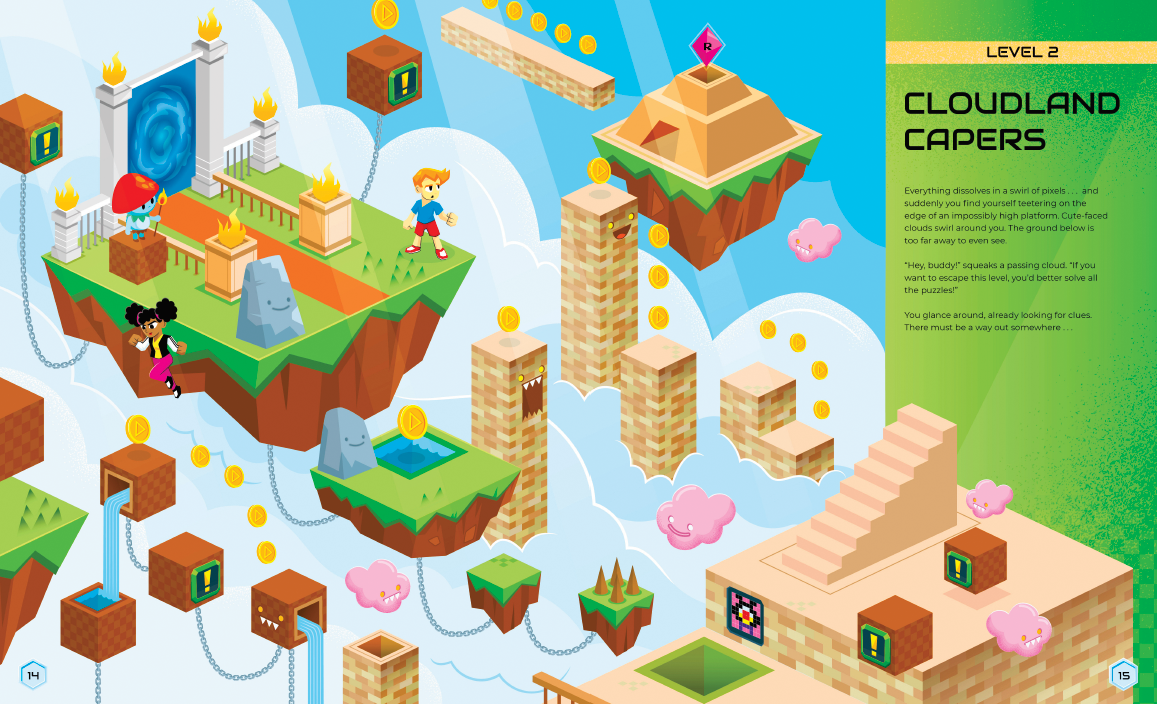 You are trapped inside a video game! Can you make your way through the levels and escape? Use the contents of this pack to help you find your way through six progressively more fiendish game levels: along the way you'll explore a futuristic city, mine and craft your way through a blocky world, try to survive an action-adventure level, puzzle through a super-cute platform level, and more.