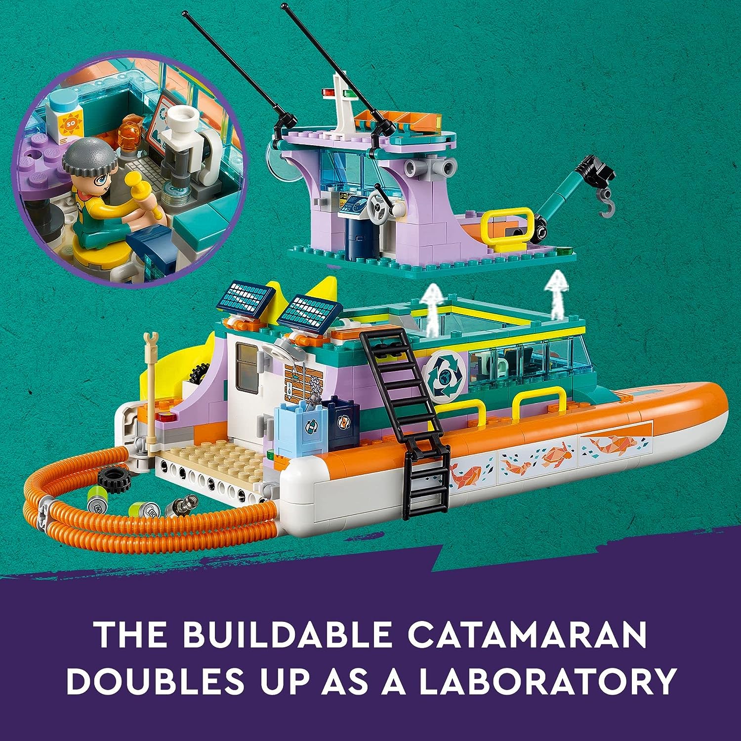 Kids who care about the natural world can learn about ocean life with this detailed LEGO Friends Sea Rescue Boat toy building set for boys and girls ages 7 and up. The set comes with 2 boats, a buildable catamaran that doubles up as a laboratory, plus a small submarine toy. Kids can act out sea rescue stories as they roll the boat over the trash to capture it in the boat’s nets, ready for recycling. The mini-dolls Nova and Aliya didn’t think that they had much in common with one another but are becoming closer as they take on this shared mission. Kids can enjoy an easy and intuitive building adventure with the LEGO Builder app. Here they can zoom in and rotate models in 3D, save sets and track their progress. This set can be combined with LEGO Friends sets 41736 and 41752 for even more ocean rescue adventures (sets sold separately). Meet the next generation of Heartlake City who inspire kids to develop their passions as they explore the new world of LEGO Friends with its diverse cast of characters. Contains 717 pieces.