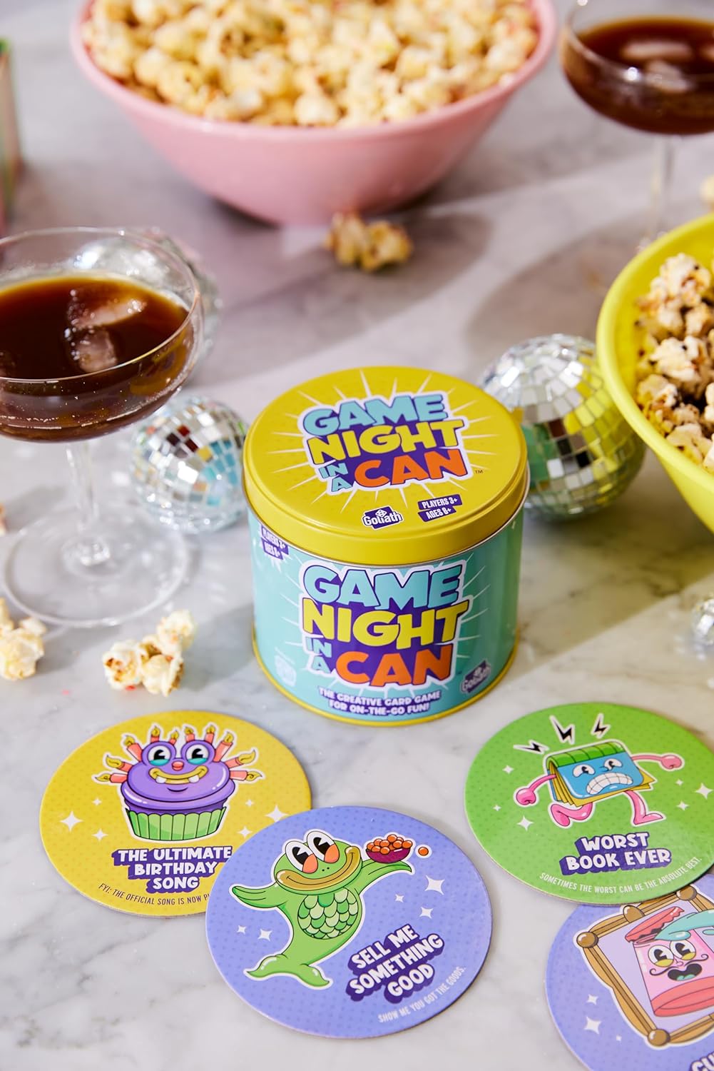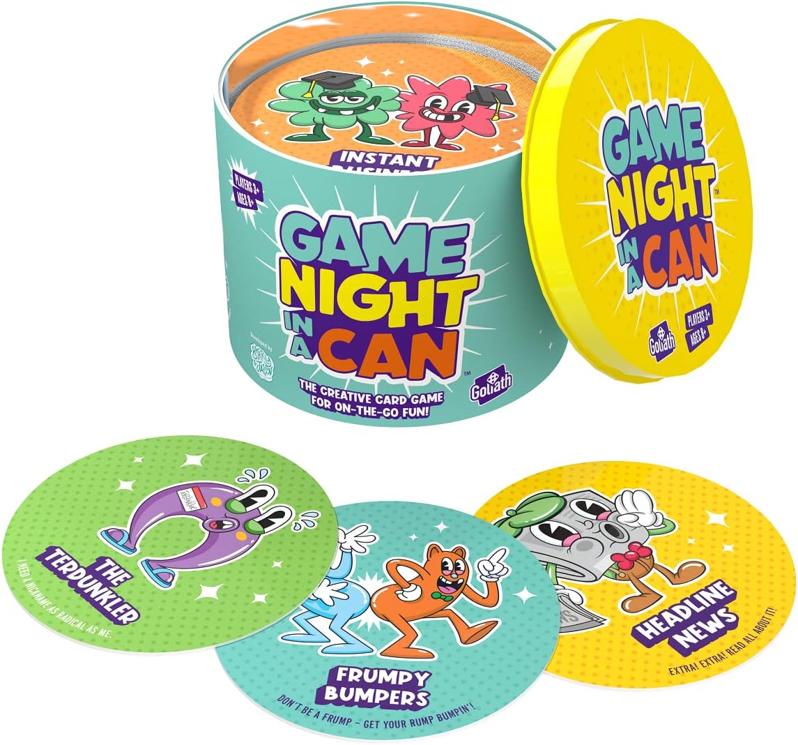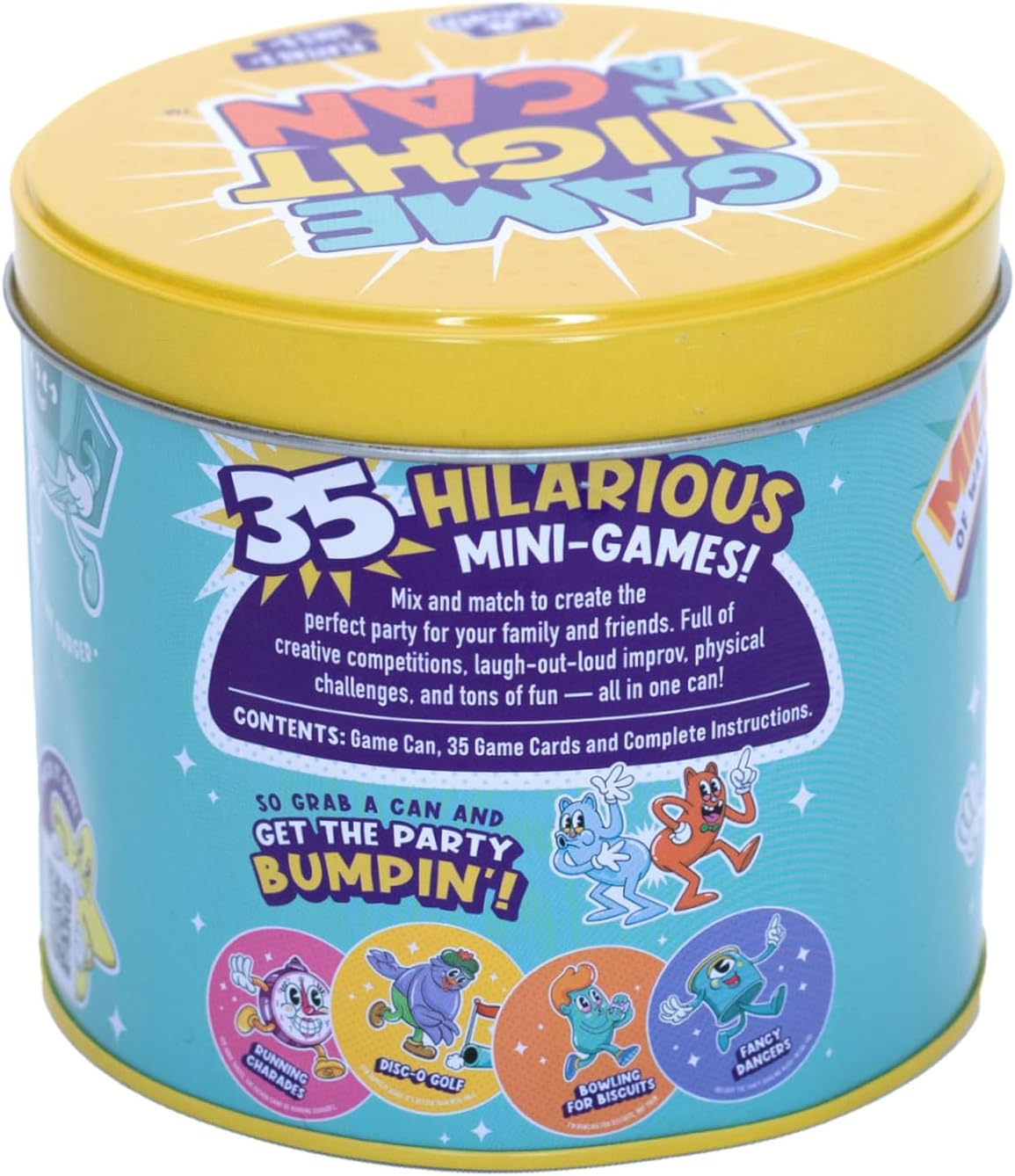 This little can makes for one BIG game night! Choose from 35 hilarious and challenging mini games to make your own game night competition. Get ready to toss, draw, and act your way to victory! The team with the most points at the end is crowned game night champion! Includes 1 Game Can, 35 Game Cards, and Complete Instructions. Recommended for 3 or more players, ages 8 and up.