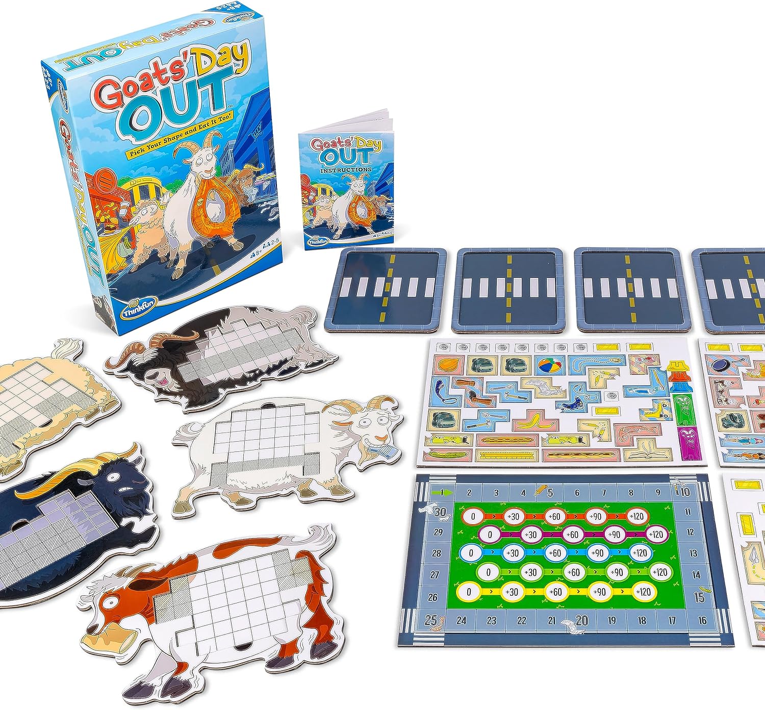 The Goats have gone wild and are eating everything in town! Choose a goat and pick from the pieces in your tray to start stuffing their bellies. The food supply rotates as the goats chomp, munch, and consume their way around time. This isn't just a feeding frenzy, you have a gut to fit the food into! Great for groups of friends, this wacky, fast-paced game will have you laughing as hard as you are thinking! Perfect for a game night with goofy goats keeping the party lively! Stay ahead of the game by strategizing which pieces fit best inside your goat's stomach. But don't get too far ahead of yourself, as the trays rotate every turn and the goats every round! Much, crunch, arrange, pass, repeat! Enjoy hours of entertainment with ThinkFun's Goats' Day Out! Please note: No real-world goats were harmed in the making of this game! Just goat-fueled fun, frivolity, and chaos included!