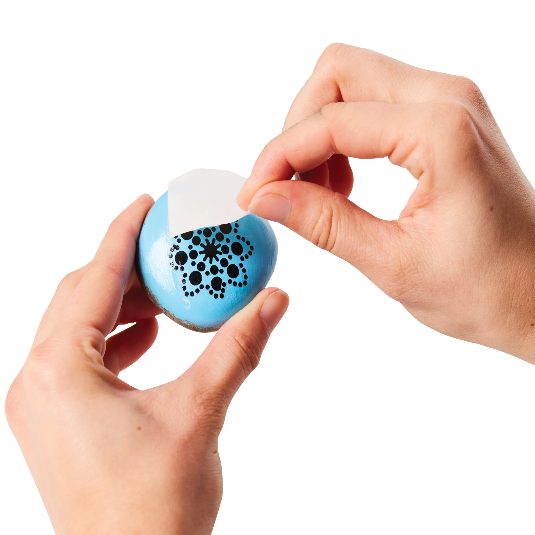 Once you have painted and created dot art place the clear tracking stickers on the bottom of your rocks to follow your rock’s travels.