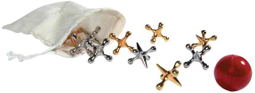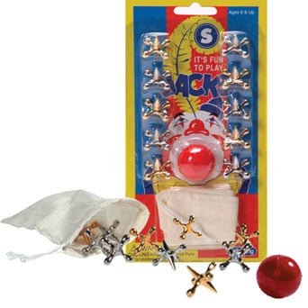 Gather around for this old fashioned game. With each bounce grab a jack until all have been collected, then toss them back in the circle and start again! With each new round of play, you pick up an additional jack each time until you reach ten. The player who reaches 10 first wins! Includes 10 gold and silver die cast jacks, a rubber ball, a cloth pouch and instructions. Measures 7.5 x 4 x 1 in pkg. WARNING: CHOKING HAZARD Small parts. Toy contains a small ball. Not for children under 3 yrs.
