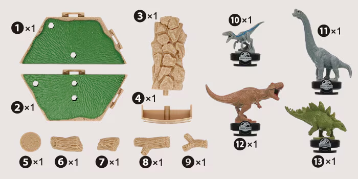 From EPOCH Games! Balancing Game with Jurassic World themed stage and dinosaur pieces! Jurassic World Island Quake is a simple balancing game. Toss the medal and move the figure or the branch piece onto the stage. Be carefull not to topple off the pieces from the stage!4 Jurassic World Dinosaur figures are included.