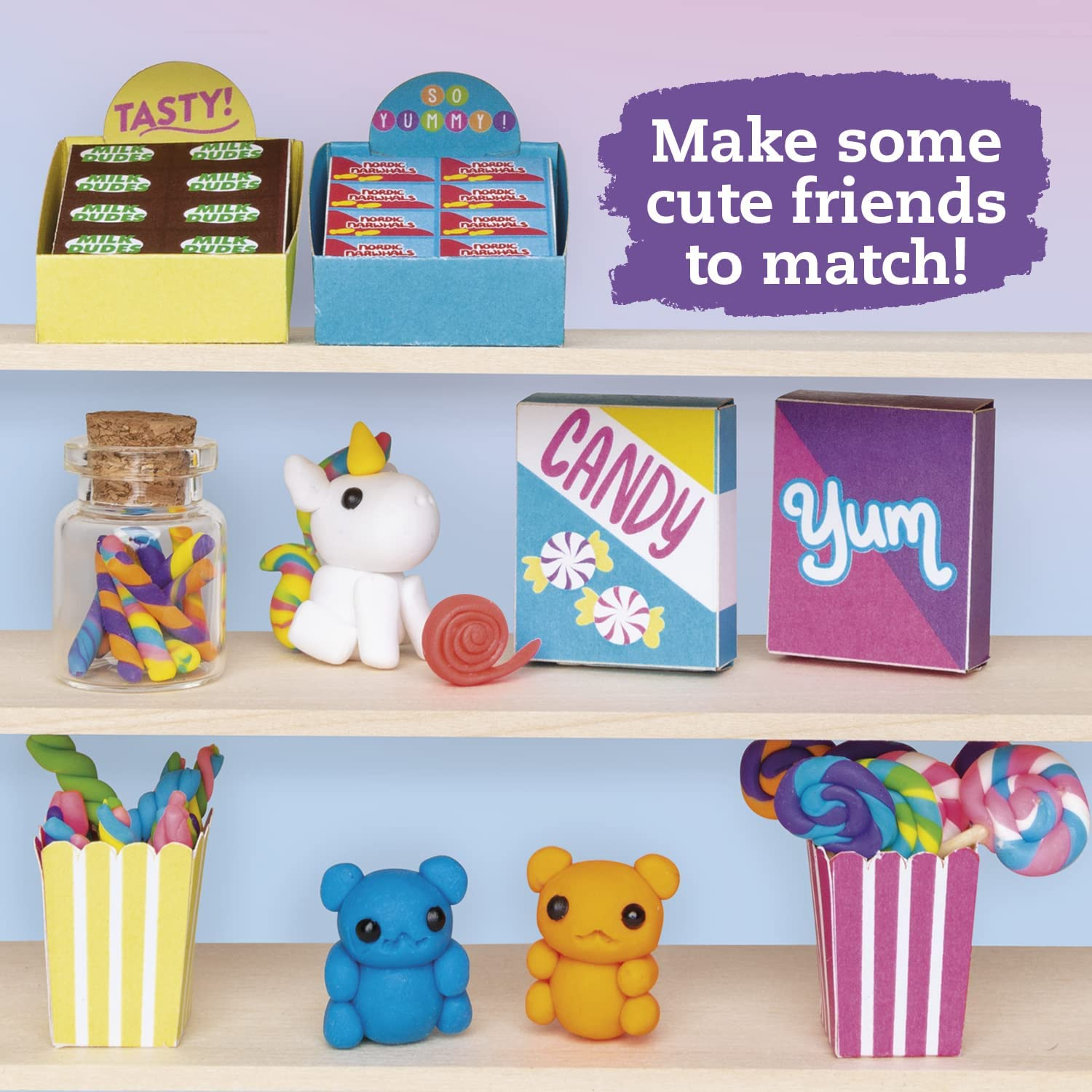 The perfect miniature scene for crafters with a sweet tooth! Dazzling candy-colored clay and puffs of pastel cotton let you re-create all sorts of confectionery, from sour gummies to rainbow ribbon candy, tie-dye jawbreakers, swizzle sticks, clouds of cotton candy, and more! Creative prompts encourage crafters to invent their own candy brands, and display them in clear glass-looking jars with stoppers, in miniature boxes, on wooden lollipop sticks, or in iridescent cellophane baggies with twist ties. Slot together the cotton candy stand with a clear dome to serve your customers, and a tented kiosk to display your assortment of sweet treats. (Don't forget the unicorn mascot!) With true-to-size guides and step-by-step instructions, even novice crafters can create projects that look good enough to eat!