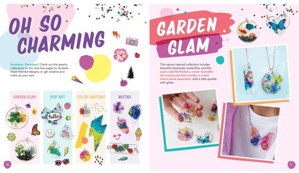 Make 27 custom-shaped charms with a resin-looking finish. Using the see-through charm blanks, add crystal clear glaze to layer your collage pieces and sprinkle any of the 3 glitters for sparkle. Choose from 1 of the 4 themes in the book or mix and match the collage pieces to show off your personal flair!