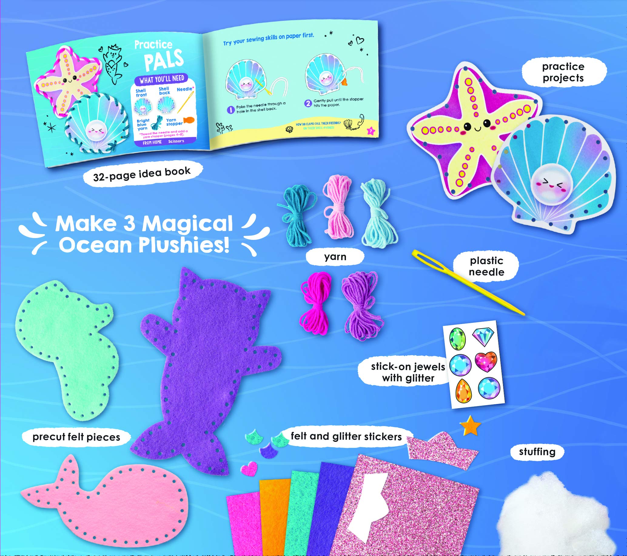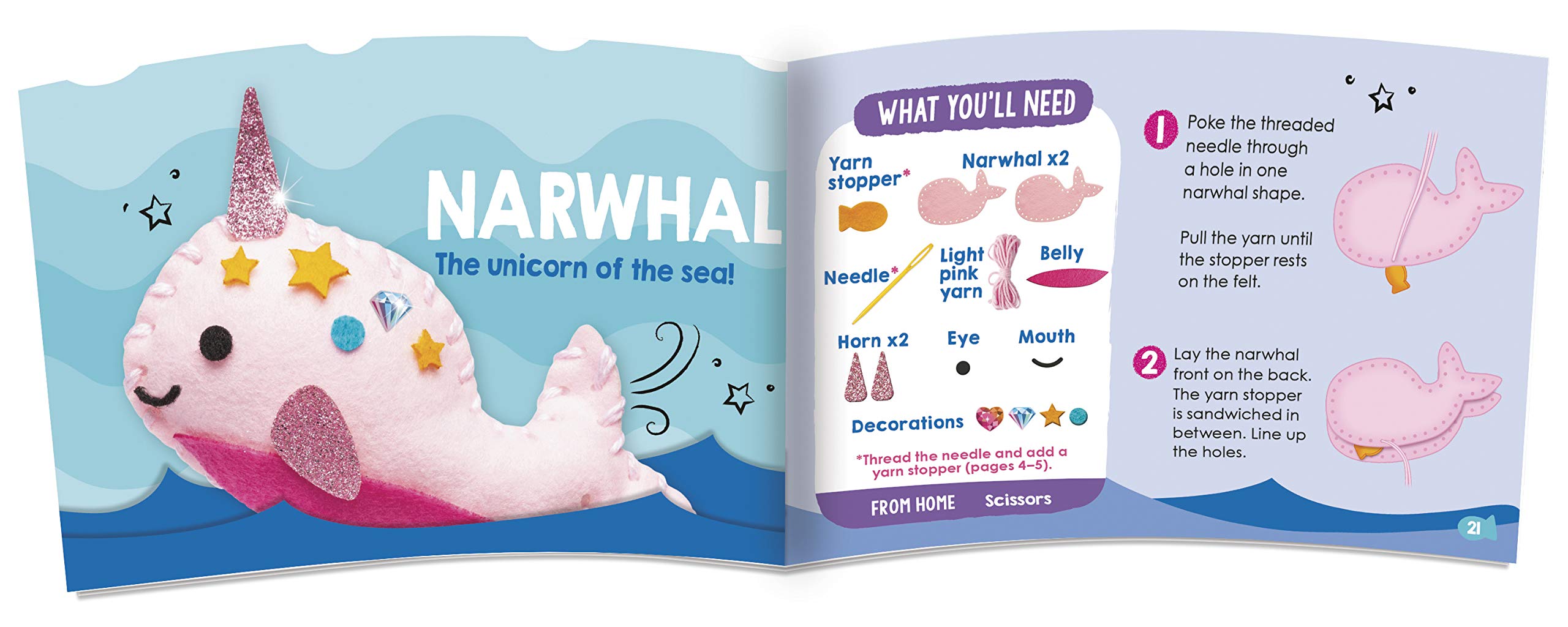 Build fine motor skills and learn to sew with a cat-tastic mermaid and her sweet sea critter friends. Start with simple lacing cardsfeaturing a seashell and sea star, before you dive into the three felt projects: seahorse, narwhal, and a cute cat mermaid. Get creative by decorating your undersea friends with felt stickers and glittery embellishments. (Because every mermaid needs a crown!)