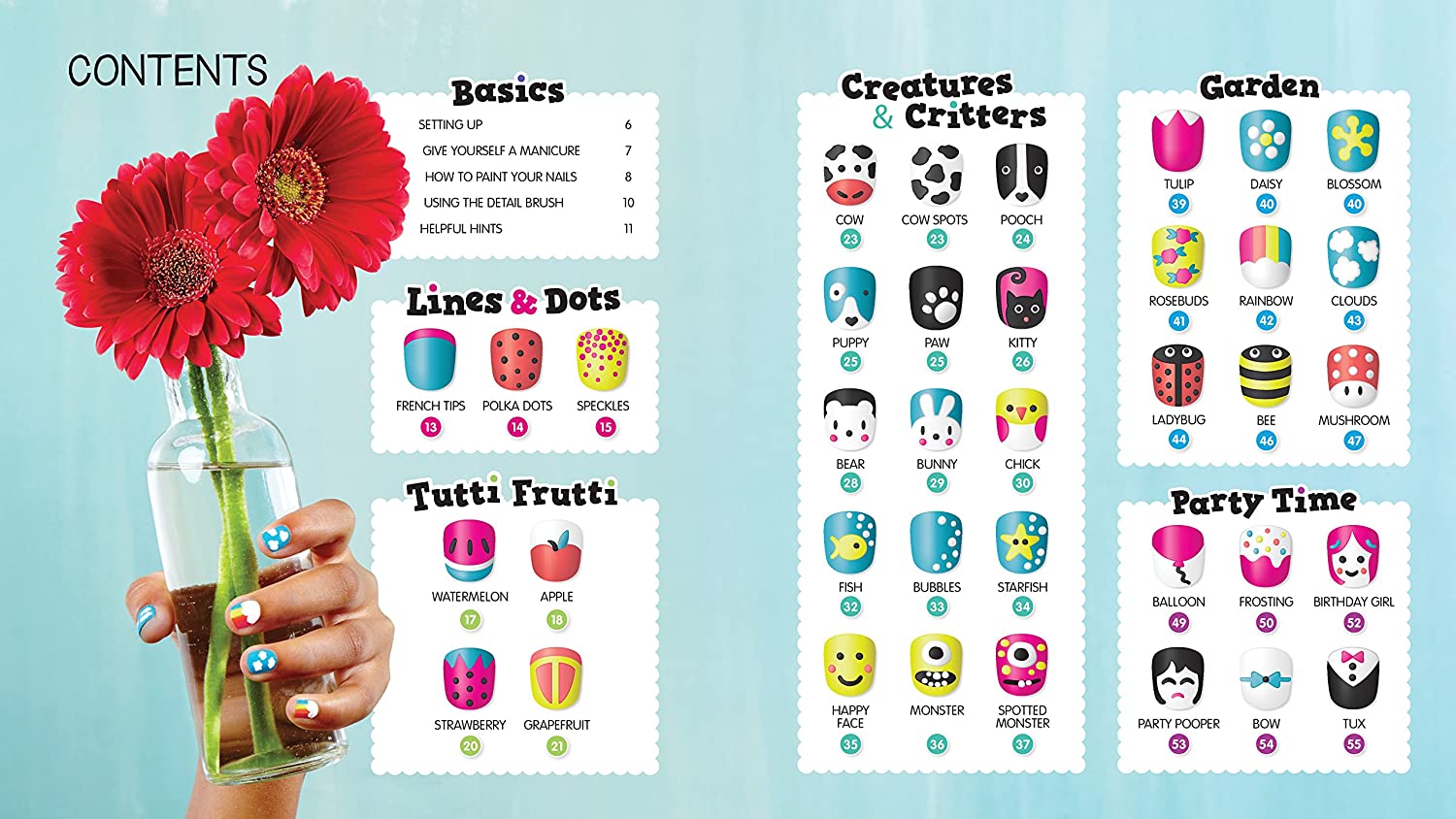 This time-tested favorite is a fully-photographic instruction book packed with tips, techniques, and over 35 designs to paint on fingernails (and toenails, too). With 6 colors of water-based, non- toxic, peel-off nail paints, you can try every design idea on (and off - and on - and off) with no nail polish remover required.