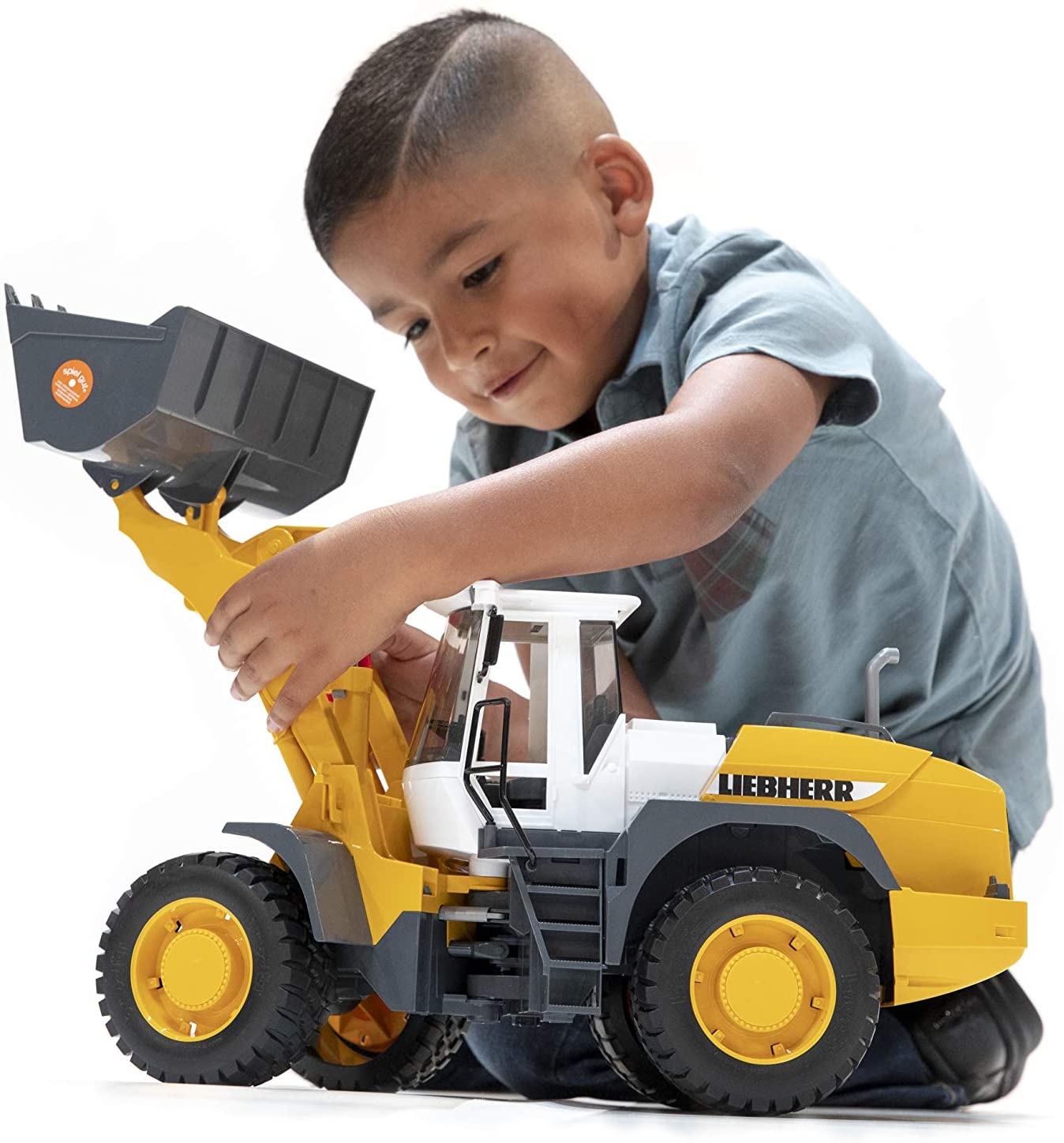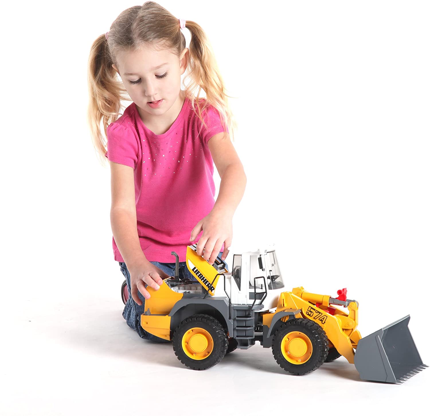 Steer clear of trouble! This tough construction vehicle has articulated steering, allowing it to make sharp turns and fit into small areas. The front loader can be raised or lowered with the attached handle, or locked into place when not in use. Other features include suspension for the rear wheels, a hood that opens to reveal the engine and tread tires.