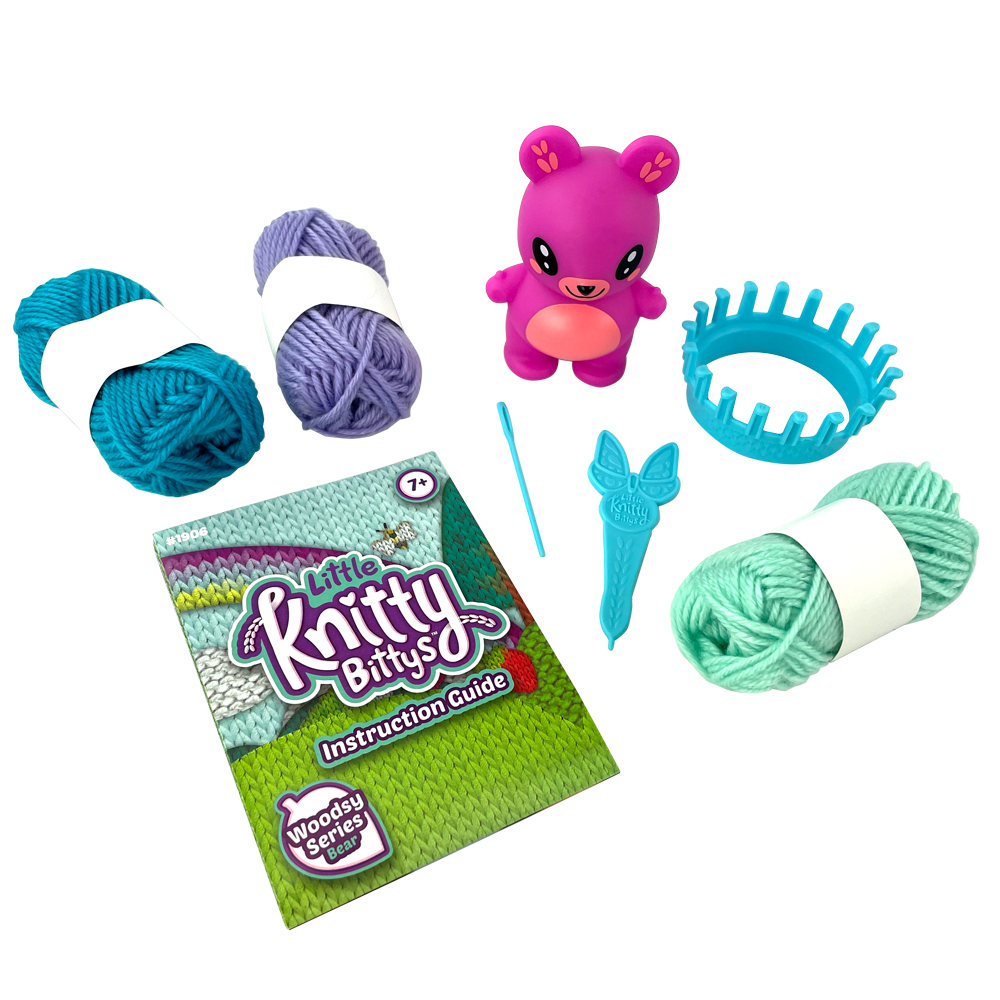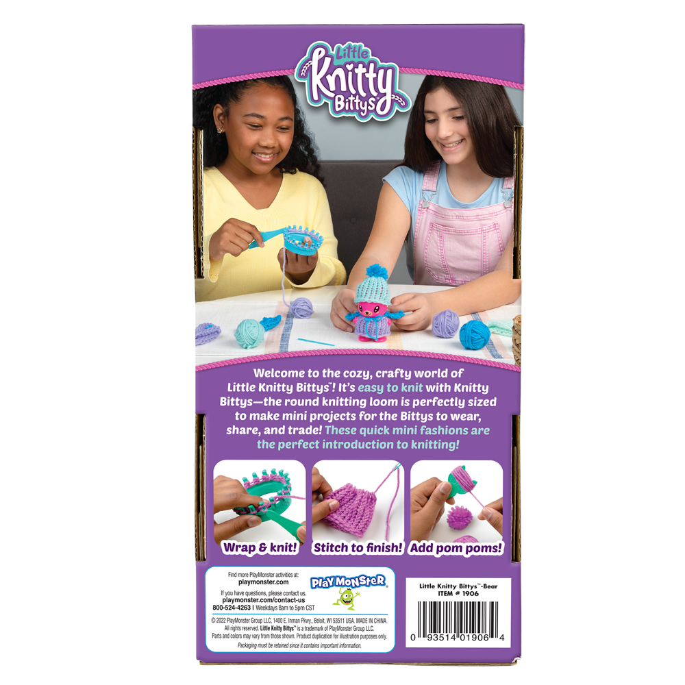Welcome to the cozy, crafty world of Little Knitty Bittys! It’s easy to knit with Knitty Bittys and make adorable outfits for your Bear! The round knitting loom is the perfect size to make mini projects for your Bittys to wear, share, and trade. The illustrated guide gives step-by-step instructions for making each item, and includes variations and customization ideas for them as well!