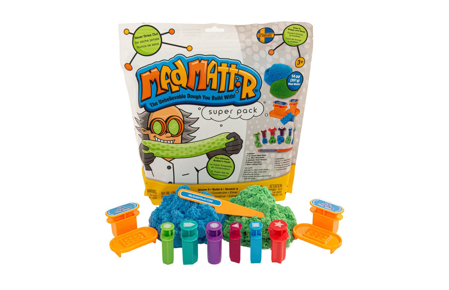 Shape it! Build it! Stretch it! Do all this and more with the Mad Mattr Super Pack, the ultimate builder’s pack. The pack includes 14 oz. of Mad Mattr (7 oz. each of Blue and Green), 2 Ultimate Brick Makers, 6 Extruders, and a safe cutting tool. All of this comes in a re-sealable pouch.