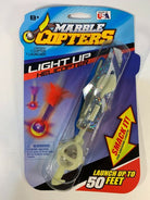 Marble Copter is a light up flying toy that is great for nighttime fun! Fling the copter high into the air using the rubber band wand. It flies up to 50 feet in the nighttime sky, lights up and glows, as the light reflects off the hologram wings, and then helicopters to the ground.