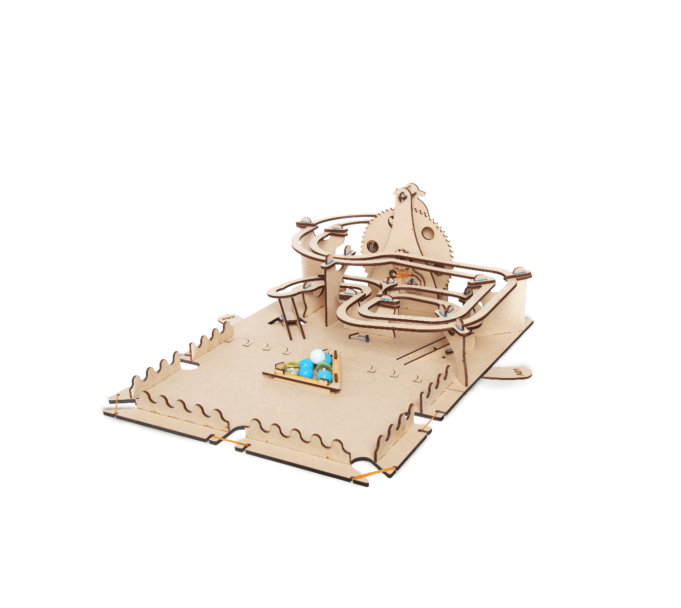 Is it a billiards table? Is it a roller-coaster? It's the Smartivity® Marble Slide! A mash-up of marble slide and billiards or pool-table game, this project is loads of fun to build and play. Based on the fundamentals of gravity, centrifugal force and banking, this build-it-yourself kit is project and game all in one! After assembling the marble slide and the base, play the game! Set the colored marbles on the “billiards table”. Insert the white marble into the wheel, roll the wheel to move the marble to the top, and release. As the marble slides down the track, use the levers on each side to aim the marble to strike the other marbles and knock them into the corner or side pockets. Play games with friends and keep score. Or experiment by moving the levers and changing the angle of the marble strike. Decorate with your own paints and markers and make it unique!