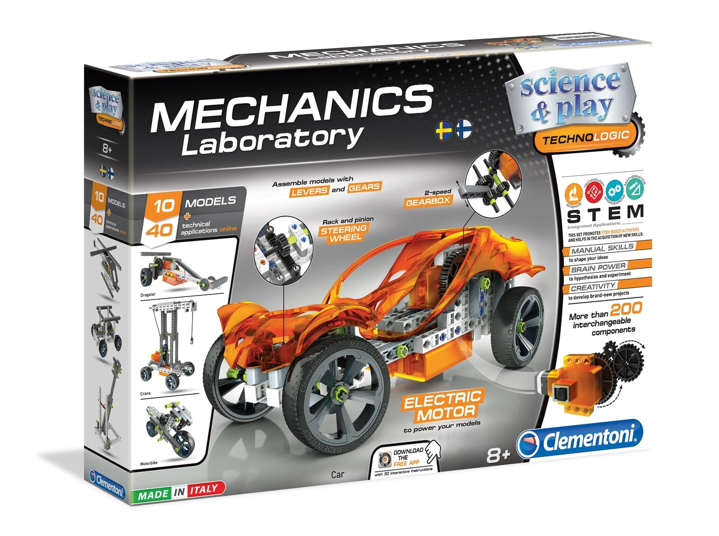 A rich laboratory which children can have fun while learning fundamental mechanical and engineering principles. Thanks to more than 250 components included in the kit, it is possible to create more than 50 constructions with increasing levels of difficulty. It is even possible to build a helicopter, an electric crane and a car with an electric motor, in which manual interaction is possible using the transmission and steering wheel! The rich illustrated scientific manual guides children through the various stages of assembly, which are all totally safe. The design, concept, development and fabrication are all completely Made in Italy!