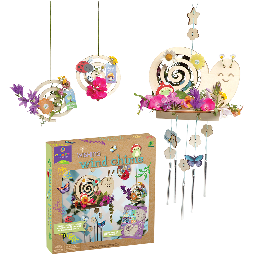 Make a wish! Craft-tastic Nature Wishing Wind Chime combines the joy of crafting, the beauty of the outdoors, and the magic of making wishes! Assemble the snail-shaped wind chime, then decorate it with items found in nature. Finally, make some wishes and attach them to the wishing chime! When they blow away in the wind, they’re more likely to come true! This kit is easy to make and requires no tools! Includes 19 pcs wood, 8.83 yds nylon cord, 5 metal chimes, 15 pcs die-cut paper, and instructions.