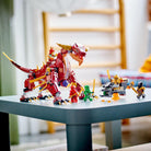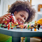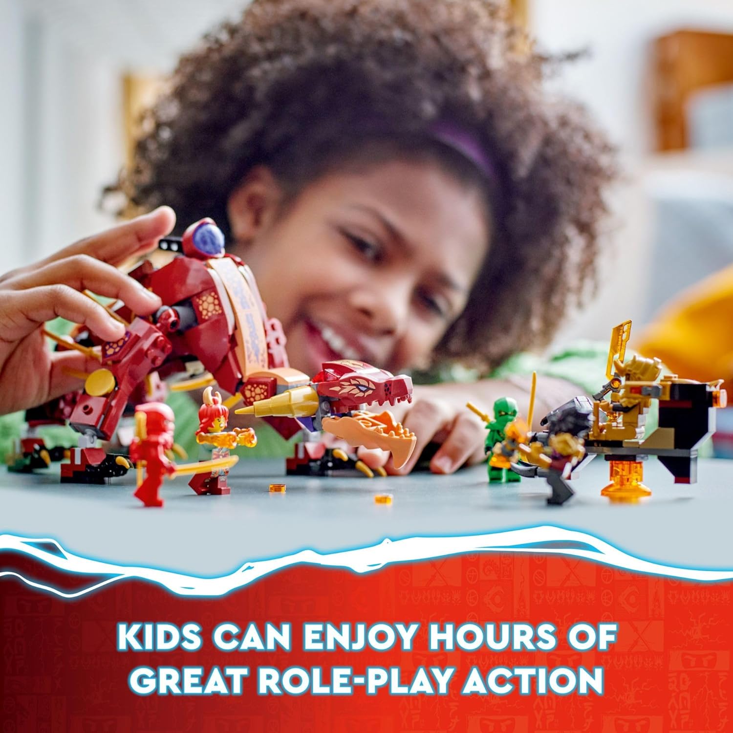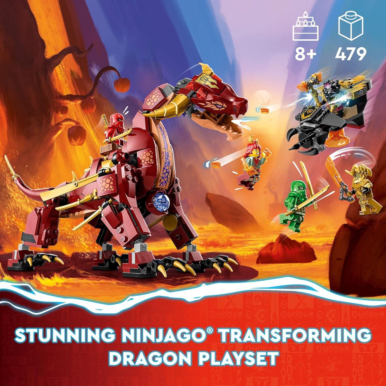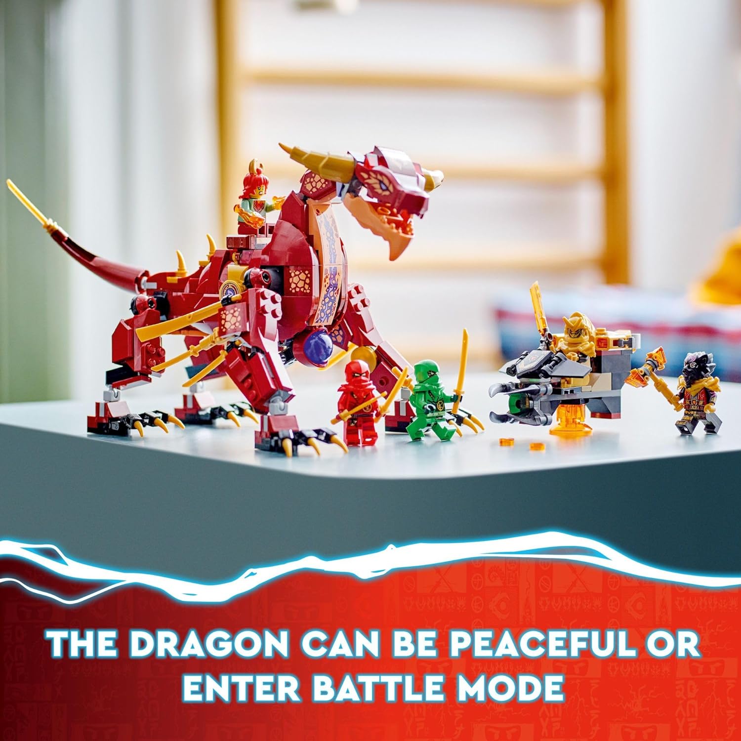 Ninja dragon toy – Enthusiastic ninja fans aged 8+ can play out battles from the NINJAGO Dragons Rising TV series with this Heatwave Transforming Lava Dragon (71793) playset 5 minifigures – This NINJAGO set comes with Kai and Lloyd, each armed with 2 katanas, Wyldfyre, Imperium Claw Hunter with an Imperium sword and Lord Ras with a golden hammer Dragon with 2 mood modes – Kids can flip the dragon toy upside down to switch it from peaceful mode to battle mode and fire out the purple dragon power element from its chest Hovercraft vehicle – Lord Ras can fly into battle on a hovercraft, which has a function that allows it to either spin when struck by the dragon power element or grab it More ninja action – Look out for Sora’s Transforming Mech Bike Racer (71792), Lloyd and Arin’s Ninja Team Mechs (71794) and other sets in the LEGO NINJAGO range Build and play – This 479-piece playset gives kids aged 8+ a creative building experience before they escape to NINJAGO City, and can be given as a birthday present or everyday gift Play and display – Measuring over 7 in. (18 cm) high, 11.5 in. (29 cm) long and 6 in. (15 cm) wide, this transforming dragon can be proudly displayed by kids in their bedrooms