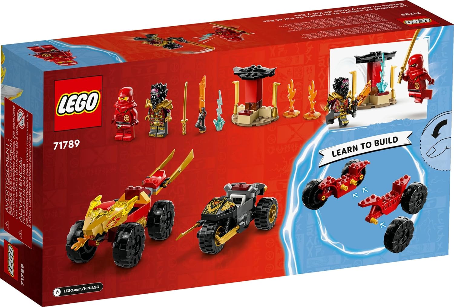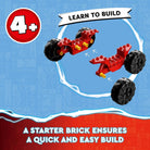 Beginner LEGO set – Little Ninja fans ages 4+ can recreate action from the NINJAGO Dragons Rising TV series as they learn to build with Kai and Ras’s Car and Bike Battle (71789) playset 2 minifigures – Includes Kai and Lord Ras, who has a golden hammer, for little ninja fans to play out exciting good-vs.-evil battles Ninja race action – With this Ninja car toy Kai can race in a dragon race car armed with golden blades against Lord Ras in his all-terrain vehicle with golden rammers Blue lightning – The playset comes with a piece of blue lightning in a display holder, which the characters need to seize to win their battle Little extra treat for kids aged 4+ – Great birthday gift for toddler ninja fans as they develop their storytelling skills Fun on the go – Kai’s dragon race car measures over 2.5 in. (6 cm) high, 8.5 in. (22 cm) long and 2.5 in. (6 cm) wide so kids can take it to their friends’ houses for playtime A new way to build – The LEGO Builder app guides kids on an intuitive building adventure. They can save sets, track their progress and zoom in and rotate models in 3D while they build