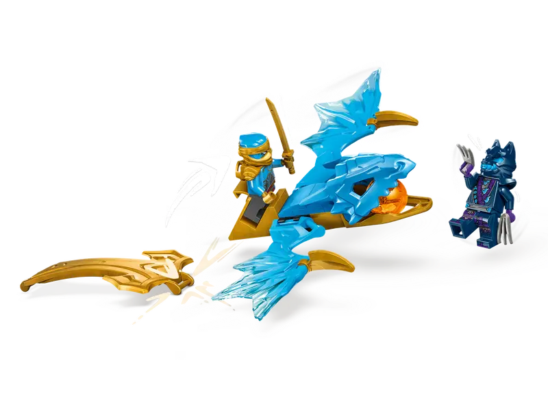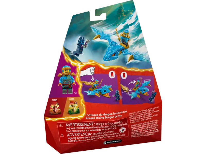 Boys and girls aged 6 and up can recreate action-packed scenes from season 2 of the NINJAGO® Dragons Rising TV show with Nya’s Rising Dragon Strike (71802) ninja playset. Kids will be excited to build the first-ever LEGO® NINJAGO dragon action toybefore they slam down the dragon’s golden tail and watch as it bursts into action. This building set comes with 2 minifigures: Rising Dragon Nya, who comes with a katana sword accessory and can ride on the dragon model, and a Wolf Mask Claw Warrior wit h claws. Kids can stage epic battles between the ninja figures to win the orange dragon power element from inside the blue dragon’s posable mouth. The rest of the LEGO NINJAGO range of buildable ninja toys for kids includes mechs, vehicles and temples so fans can role-play adventures with their heroes (sets sold separately). Each fantasy toy can be created with the LEGO Builder app, which guides you and your child on an easy and intuitive building adventure. Action-packed dragon toy for kids – Boys and girls aged 6 and up can play out battles from season 2 of the NINJAGO® Dragons Rising TV show with Nya’s Rising Dragon Strike gliding dragon toy Ninja action toy – Kids can place Rising Dragon Nya onthe back of the blue dragon toy, slam down its golden tail and launch them both forward 2 LEGO® NINJAGO® minifigures – This ninja playset features a Nya minifigure armed with a mini katana sword accessory so kids can role-play clashes with a Wolf Mask Claw Warrior Dragon power element – Blue dragon fantasy toy includes an orange dragon power element in its mouth Ninja gift – LEGO® NINJAGO® set provides a fun build-and-play experience and is a gift idea for kids who deserve an unexpected treat Bigger ninja adventures – Look out for more LEGO® NINJAGO® toys (sets sold separately) to stage races between them A universe of ninja toys for kids – LEGO® NINJAGO® sets include mechs, vehicles and temples, and let kids escape into a fantasy worldof adventure with their ninja heroes Measurements – This 26-piece LEGO® building toy includes a dragon action toy measuring over 1 in. (2 cm) high, 7 in. (18 cm) long and 7 in. (18 cm) wide