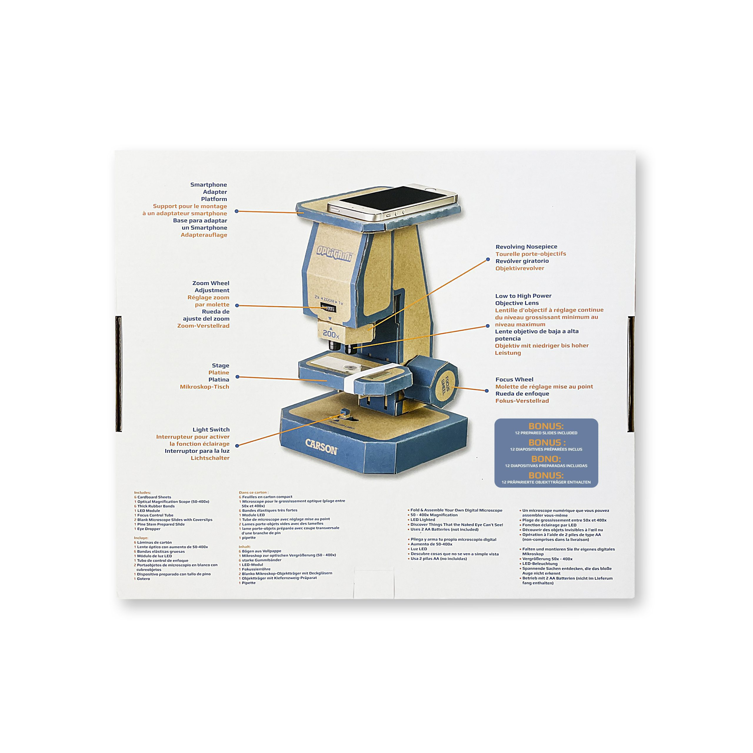 Have fun viewing the included prepared slides. With a powerful 50-400x magnification, the Optigami will help you discover things the naked eye can’t see.