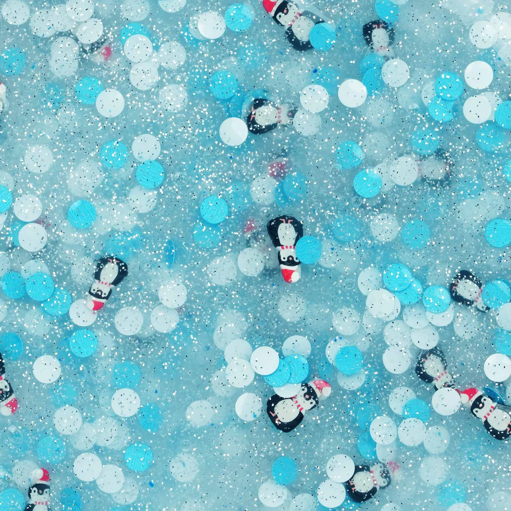 Color: Clear base with silver mini glitter pieces, white and blue dot glitter, and clay penguin pieces