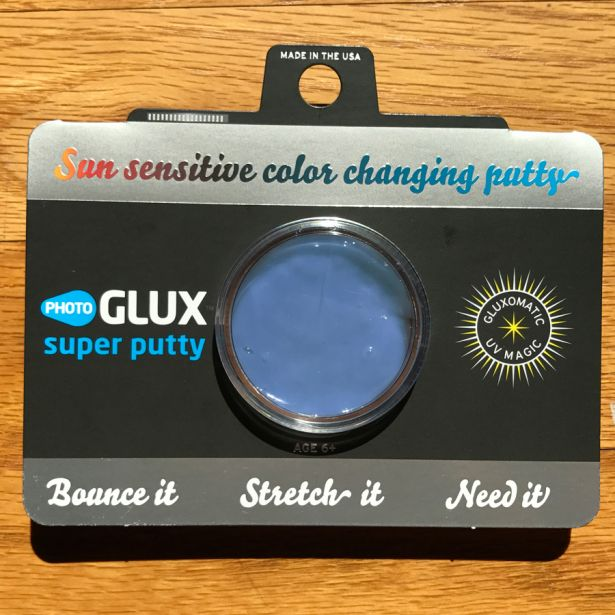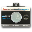 Our new GLUX putty is sensitive to U.V. light, so it changes color in the sun. It. Bring it out on a bright day and it will turn blue. Place an object on it and you will create a silhouette print. Now that’s the picture.