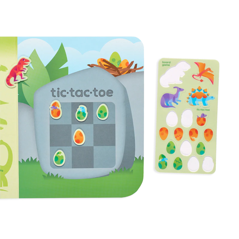 Whether you are traveling or in need of stay at home kids activities; this reusable sticker and activity book does it all. Imagine playing with cute dinosaur stickers with no mess. Daring Dinos Play Again Activity Book features a board game, match and learn, tic tac toe and a scene board to fill with colorful dino stickers.