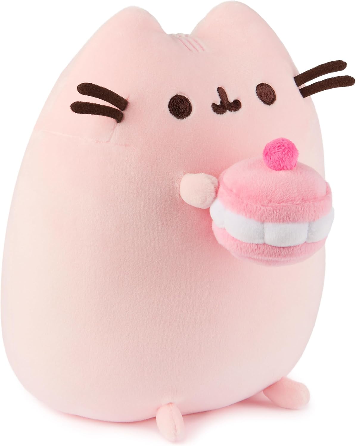 Join Pusheen for a sophisticated snack! This adorable, super-squishy plush features the lovably lazy tabby clutching a pink-and-white cherry macaron, about to indulge in a classic French treat. Her pastel pink plush is accented by deep brown whiskers, matching facial embroidery, and pink stripes on her back and tail. Give her a hug – this Squisheen is made from premium soft plush materials that are squishy and oh-so-satisfying to squeeze! Pusheen is the sweet, lazy, plump tabby cat who loves to bring smiles and laughter to people worldwide in her popular webcomic, which is followed by over 10 million social media fans. Our collection of GUND Pusheen plushies brings this lovable kitty and her adventures with Sloth, Stormy, Pip, Cheek, and more to your home, desk, or wherever you might want a smile. GUND Pusheen stuffed animals make adorable home decor and exciting gifts for cat lovers, Pusheen fans, and collectors of kawaii plush.