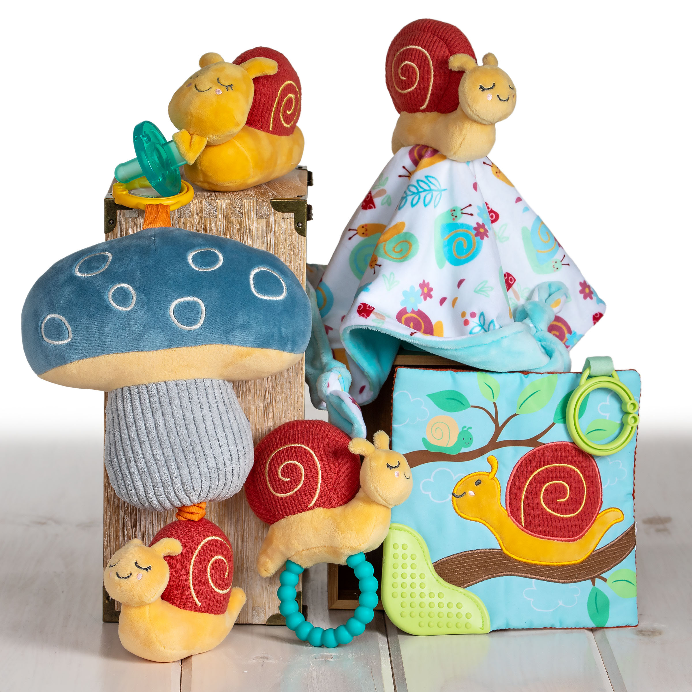 Mother Nature gives us a peek onto the forest floor with earthy, natural colors and characters. An adorable smiling snail and a fanciful mushroom in textured fabric provide a tactile experience that encourages exploration and sensory development.
