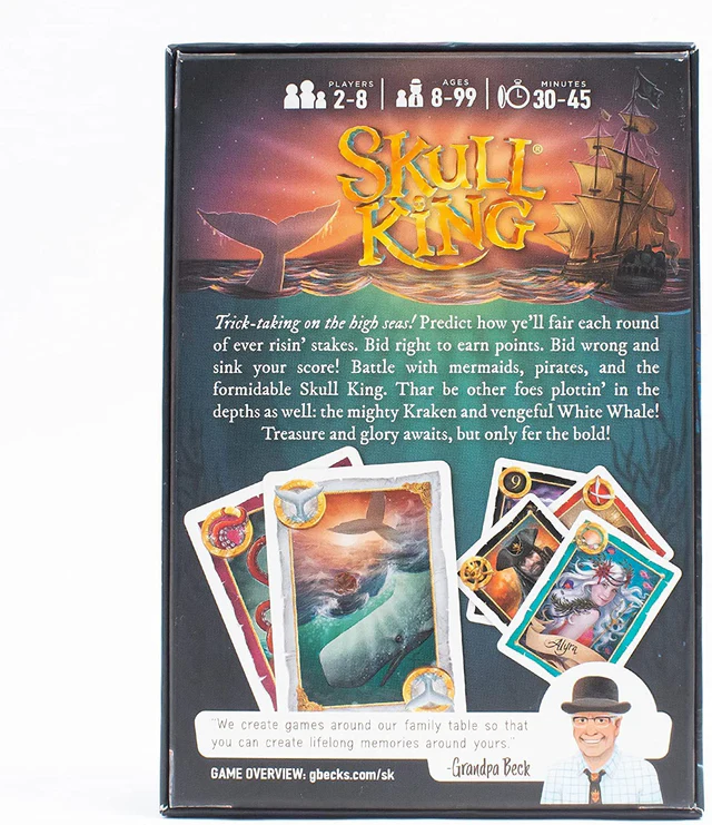 This newly revised version of the game includes the original game, beloved by pirates world-wide, and new expansion cards and rules (included with the game) that elevate Skull King to a higher level of strategy and scheming.