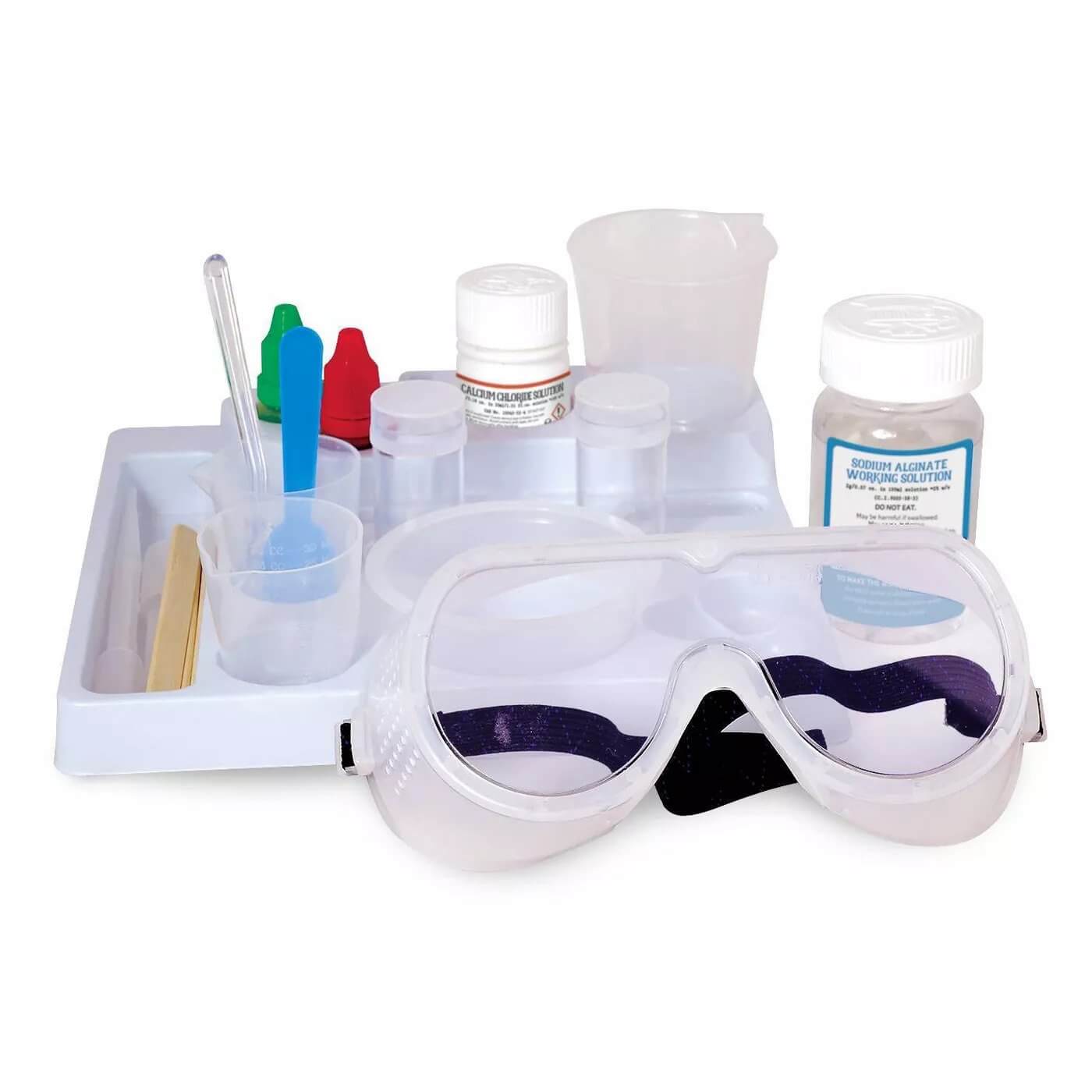 Get ready for ooey, gooey, slime-splatting polymer science with the Science Academy's Slime Lab! Slimy stuff is EVERYWHERE! Our bodies make slime, animals make slime, even plants are great at creating gooey ooze. This entertaining kit makes it fun, easy and safe to make a variety of slimes and learn about the chemistry that occurs behind the scenes. You will grow gruesome rat gizzards, generate creepy floating eyeballs, extrude tadpoles and leeches and even explore special effects like in the movies! This hands-on kit includes: lab station, alginate, calcium chloride, face mask, goggles, beakers, stirring sticks, specimen tubes—plus much more! The full-color experiment booklet includes easy-to-follow step-by step instructions. The science of goo is waiting for you! • Strengthens fine-motor skills and promotes an interest in chemistry • Investigate polymerization and properties of semi solids ranging from slimes to gels • 23 pieces total • Adult supervision is suggested