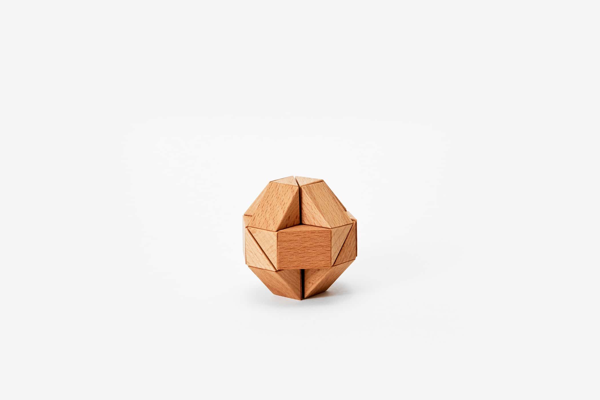 The Snake Block® is a classic toy reinvented in wood and elastic. Twist and turn its colorful blocks to create endless forms, serpentine shapes and geometric patterns, including a sphere, a swan, a dog and a fish. Composed of 24 wooden triangles with an elastic band throughout.