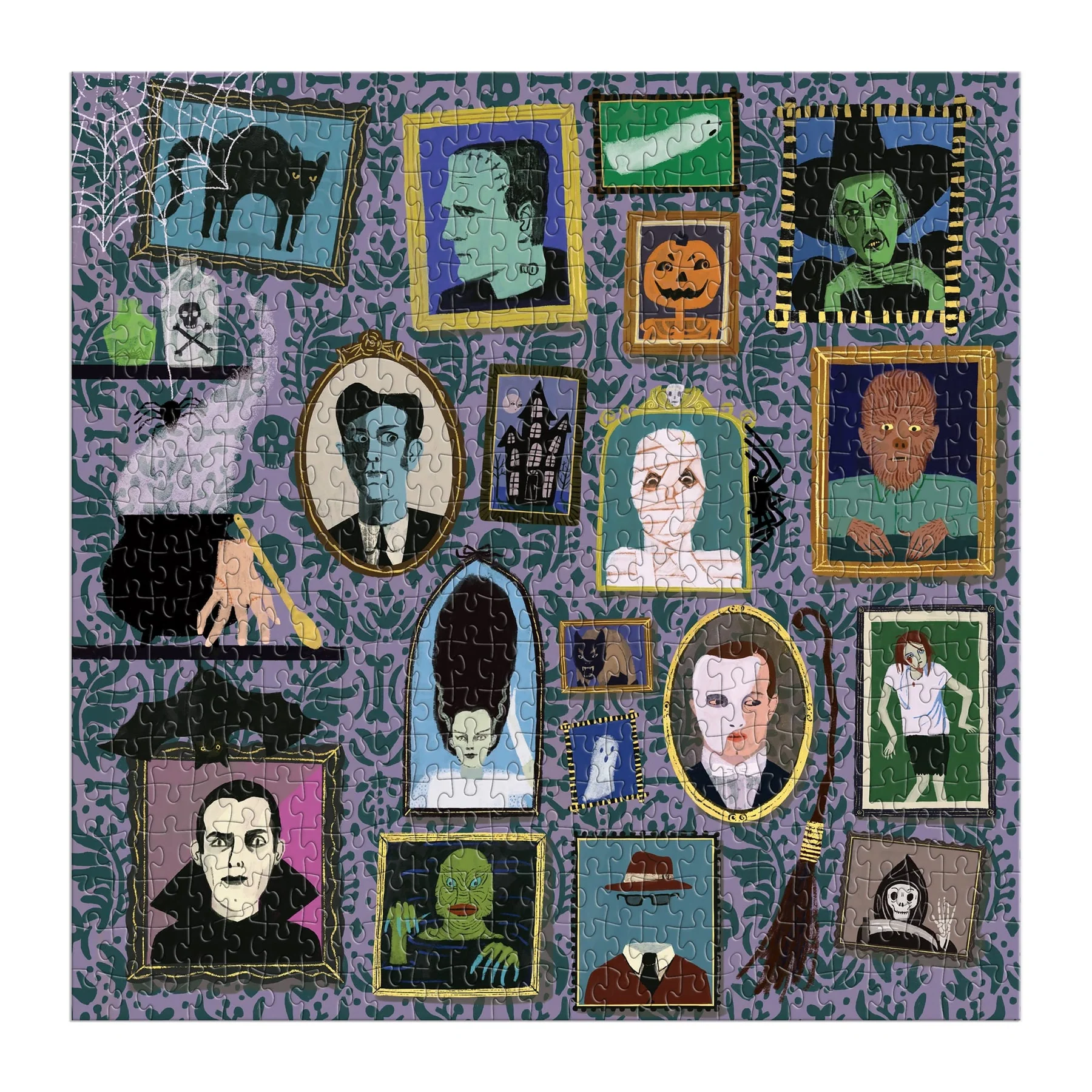 The Spooky Portraits 500 Piece Foil Puzzle by artist Anne Bentley showcases a haunting wall of portraits, highlighted with shimmering gold foil accents. Embellished with a Victorian aesthetic, this puzzle captures infamous monsters, ghouls, and supernatural creatures within its eerie frames.
