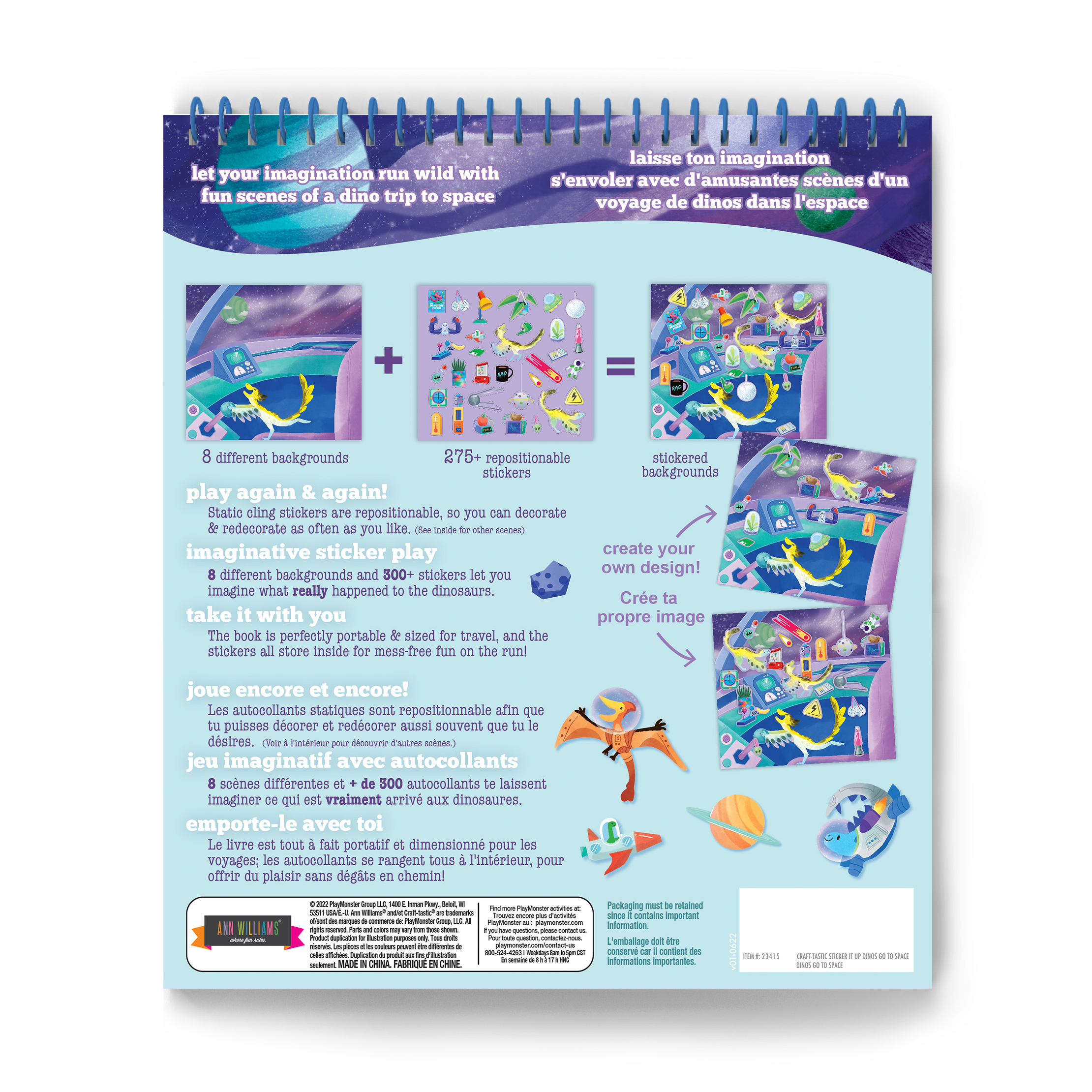 Take your imagination on an adventure with adorable scenes and dress-up characters in Sticker It Up! Dinos Go To Space! All you have to do is choose one of the eight scenes and add as many stickers from the matching sticker sheet as you like to create fun scenes: build a rocket ship, design a dinosaur space suit, meet aliens, and more! Sticker It Up! is self-contained in a booklet for a mess-free, travel-friendly alternative to coloring! Want to start over? No worries! The over 300 repositionable cling stickers are easy to remove, so you can design over and over again!