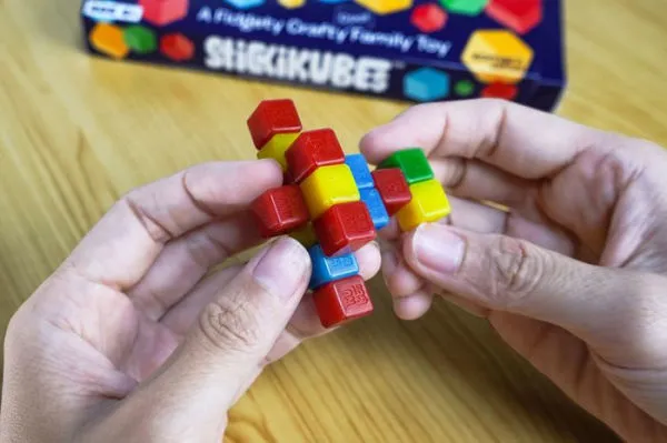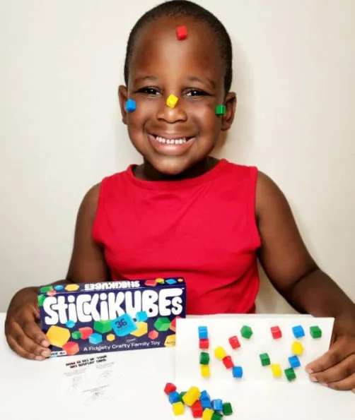StickiKubes are mini stacking cubes that stick to anything (except fabric). Kids can use them to make their own custom 2D and 3D designs, as well as to decorate anything else in the house, office, or classroom! StickiKubes are made from a customized polymer without adhesive added, making them safe for kids. They are worry-free, entertaining toys that kids love to stick to their faces and arms! Made a mess? No sweat! Simply rinse with water or wash with soap, and theyre like new...every time! The stickiness lasts forever, so cleaning is never a problem. Give em a wash and continue the fun! Comes with 36 cubes in 4 different bright colors, a custom tray, and an art display card with easel that can be used to showcase your childs creations.